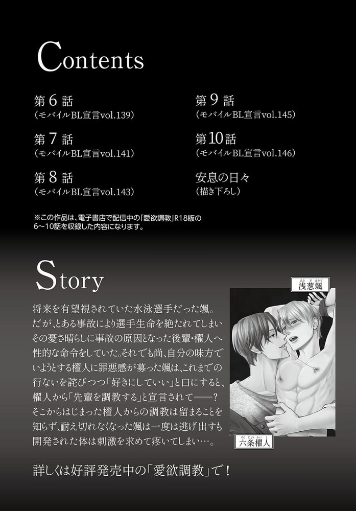 【こちらは話売り『愛欲調教』R18版6~10話を収録した単行本の電子版になります。】「俺が帰ってくるまでイってはいけませんよ」乳首に中途半端な刺激を与えられ…そのまま放置!?後輩・櫂人への罪償いから始まり今も尚、体を弄ばれる日々を過ごす颯。櫂人からの一方的な調教に“今まで自分が虐げてきた分の憂さ晴らし”だと思い込む颯だけど、櫂人の本当の狙いはどうやら違うようで…?そしてそれを知るのは、櫂人によって二人の関係に巻き込まれることになった小野崎ただ一人。常人には理解しがたい颯に対する異常な愛情を向ける櫂人の思惑とは――?
