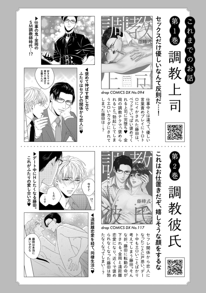 仕事で一度も褒めてくれない鬼上司・金岡主任のことが苦手だった藤田。ゲイ専門の出会い系で金岡とマッチングして以降、エッチな言葉責めプレイでトロトロにイかされ、ベッドではいっぱい褒めてくれる上司に完堕ち! 金岡の調教テクで「褒められる」と「勃起」するエロいカラダになってしまう 恋人同士になり、金岡が伝説の調教師時代に使っていたエロティックなお道具で楽しむことになって…!? そのほか、金岡を狙うハイパーイケメン・鬼頭が現れ、藤田が金岡の恋人として奮闘したり、金岡の提案で誕生日に「ポリネシアンセックス」にチャレンジと、今回も極イキエロラブ盛りだくさんの第3弾