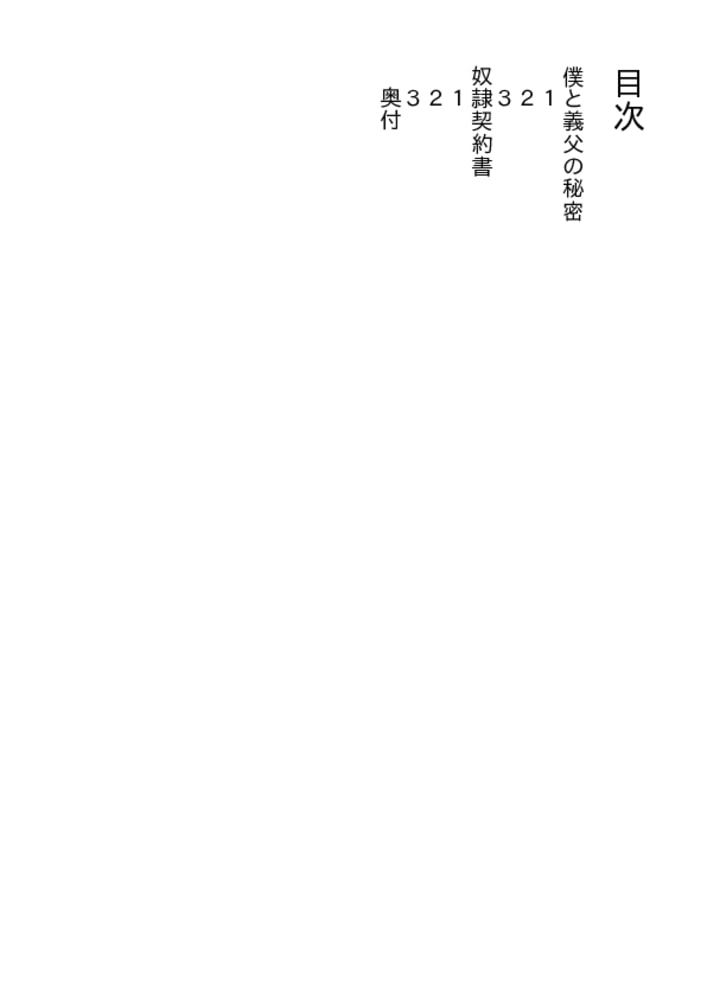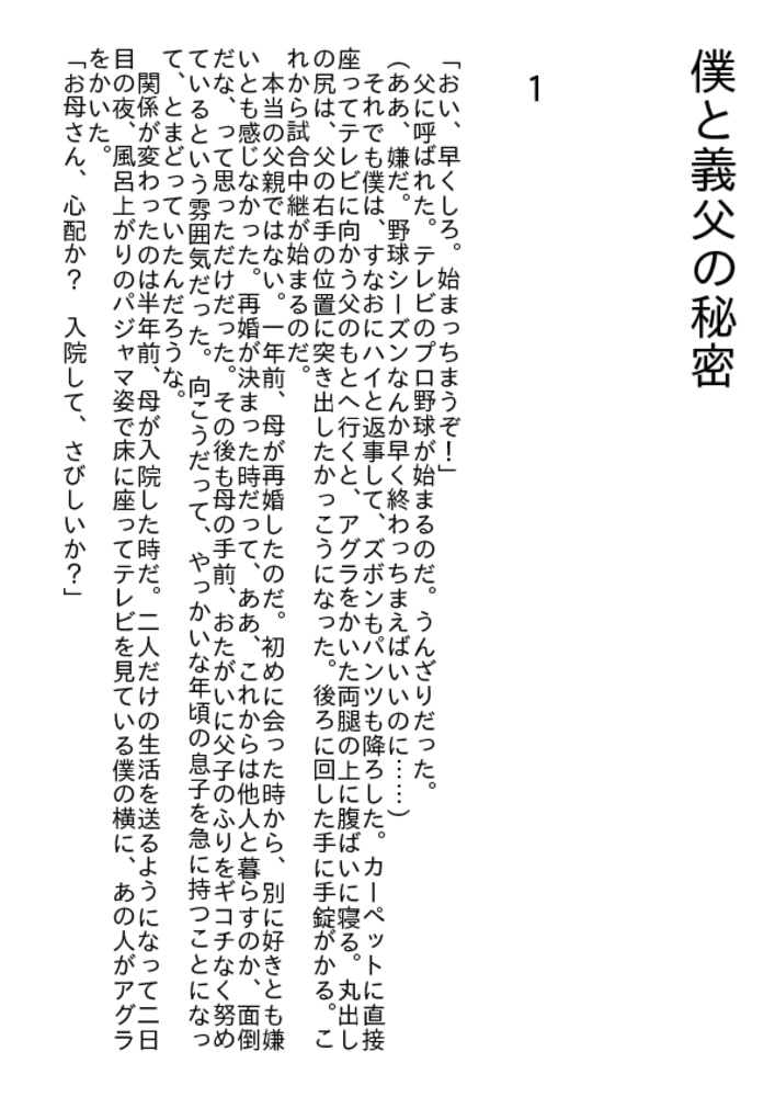 「おふくろが病気で果たせねえ大事な役目、お前が勤めるんだ。……ここでな」野獣のような本性を露わにした義父。ベルトを振り上げて鞭打ち、三回もの浣腸を施され、口を塞がれて、秘部に押し当てられる義父の性器…レ○プ同然に息子は凌○されたのだ。
