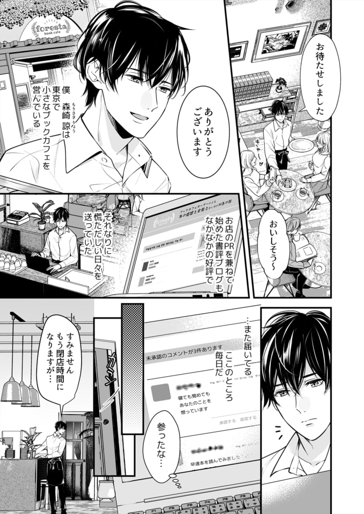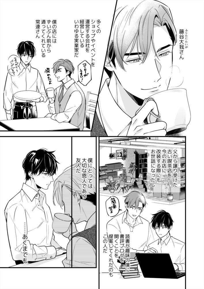 「まだ触ってないのに、こっちもぐしょぐしょだね?」カフェを営む諒は、常連客の実業家・藤谷に片想いをしている。物腰柔らかで落ち着いた色気があり、店の事で何度も相談に乗ってくれて…。大切な友人でもある彼に、こんな邪な気持ちを伝えるつもりは一切ない、そう思っていたのに―。ある理由でホテルディナーに行った夜、いきなり抱き寄せられて!?「君もそっち側の人でしょ」って、もしかして気付かれてた?ただの友人でいたかったのに、触れられると拒めなくて。年上の色気に流されるままキスでとかされ、耳元で囁かれる言葉に甘く痺れる体。極上の愛撫で暴かれた欲は奥から溢れ出し、どうしようもなく彼を求めてしまい―…