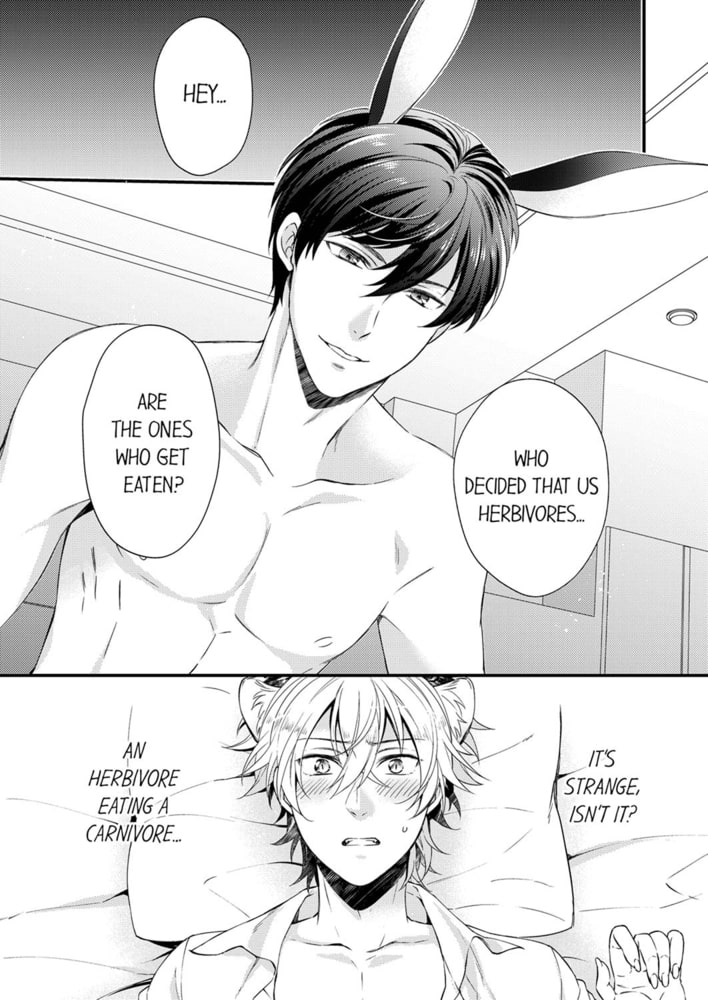 Salaryman Hyouzaki is a carnivorous leopard, but he’s been rejected by a girl once again tonight… While he’s drinking at a bar, a flirtatious-looking herbivorous rabbit named Udou appears. Even though they’ve only just met, Udou finds out that Hyouzaki has been dumped. He asks “Would you like me to teach you how to hunt for your prey?” and then Hyouzaki is forced to contend with a male in heat for the first time…!? “I’m a carnivore, and I’m being eaten by an herbivore…!?” A BL story about a scheming rabbit with an insatiable appetite for sex dominating a leopard with a weakness for pleasure!