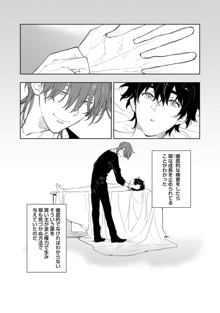 ヒトも売買対象にある現代。アクマと呼ばれる赤毛の彼は、絶対に許せない「買い主」たちを裁く「正当防衛」を理念とする救済者。そんな彼はある日、残された性玩具と目が合う。拘束具で縛られ、両膝を開ききってる彼・スイは「一緒に帰ろ」と微笑むアクマが差し伸べた手を…。「悪魔のような救済者」×「性玩具的扱いをうけてきた無垢」の優しい(←重要)救済逆調教♥