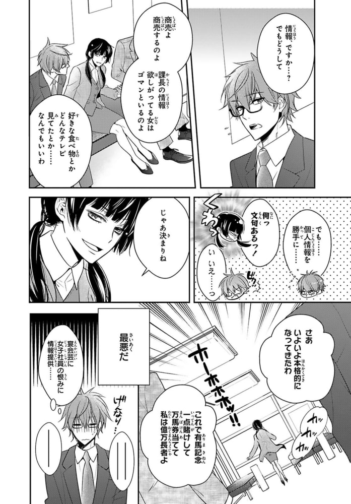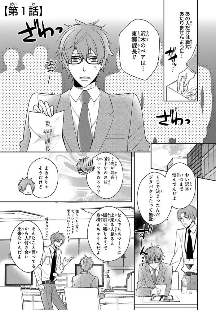 『東郷課長の危険な指先』1,2話を収録した合冊版!「俺が欲しいのか? じゃあ力を抜け」課長の熱にナカをこじ開けられる。苦手な上司だったのに、躰が壊れるまで突き上げてほしい、だなんて…ッ…!クジ運のない新入社員・沢木は、忘年会で催す宴会芸のペア決めで、直属の上司・東郷課長を引き当ててしまう。野性味のあるイケメンで何でもスマートにこなす完璧な男、東郷。一緒にいると緊張して苦手なのに、宴会芸を二人きりで準備するはめに…。するとそんなある日、東郷に初めて褒められ嬉し泣きした沢木は「そんなに俺が好きか?」とあらぬ誤解を生んでしまう!しかも東郷は男もOKなバイの、自称ヘンタイだった!?