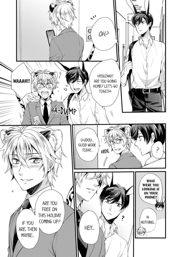 Salaryman Hyouzaki is a carnivorous leopard, but he’s been rejected by a girl once again tonight… While he’s drinking at a bar, a flirtatious-looking herbivorous rabbit named Udou appears. Even though they’ve only just met, Udou finds out that Hyouzaki has been dumped. He asks “Would you like me to teach you how to hunt for your prey?” and then Hyouzaki is forced to contend with a male in heat for the first time…!? “I’m a carnivore, and I’m being eaten by an herbivore…!?” A BL story about a scheming rabbit with an insatiable appetite for sex dominating a leopard with a weakness for pleasure!