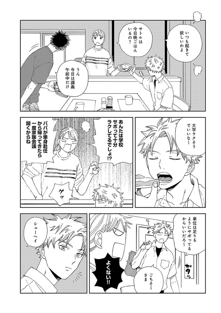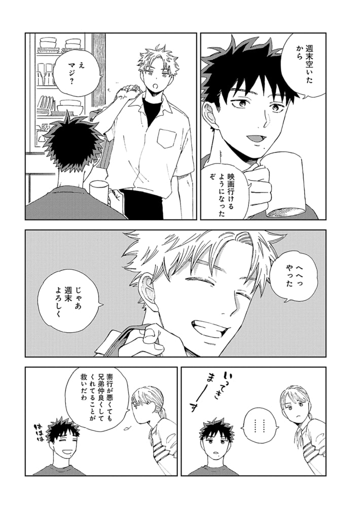 普通のどこにでもいる兄弟という関係に、段々と欲が出てきてしまう。どこにも吐き出せない気持ちを抱えたシューヘイは、隣で無防備に眠るサトルに「家族」の一線を超えた行動をしてしまいーー?