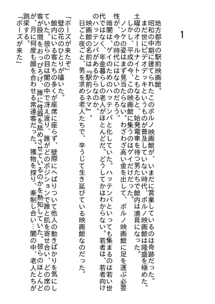 とある地方都市、駅前のポルノ映画館。場内の暗闇に集うのは、映画目当てのノンケではなく、"男"目当ての男達。ただし年齢層は高めだ。若い世代には、若者向きのゲイスポットがあるからだろう。