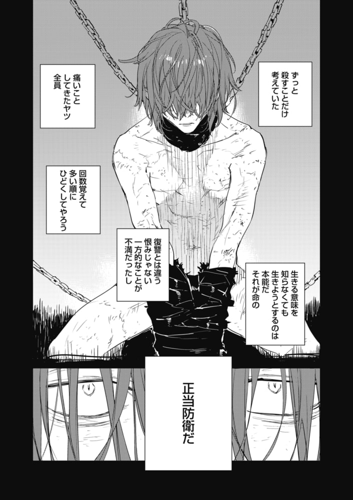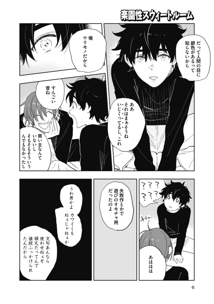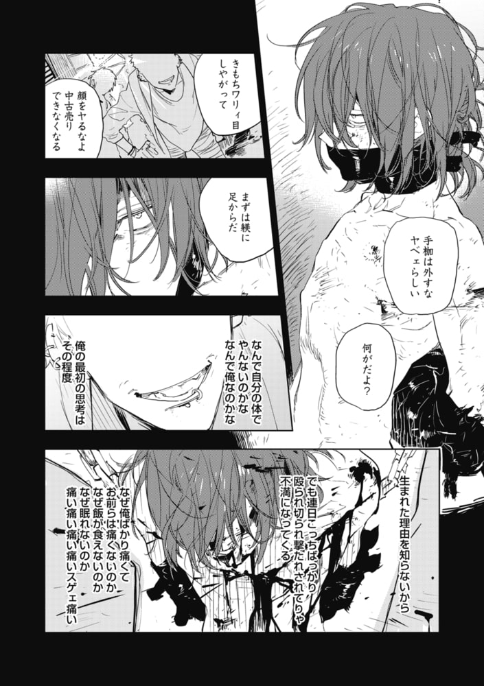 ヒトも売買対象にある現代。アクマと呼ばれる赤毛の彼は、絶対に許せない「買い主」たちを裁く「正当防衛」を理念とする救済者。そんな彼はある日、残された性玩具と目が合う。拘束具で縛られ、両膝を開ききってる彼・スイは「一緒に帰ろ」と微笑むアクマが差し伸べた手を…。「悪魔のような救済者」×「性玩具的扱いをうけてきた無垢」の優しい(←重要)救済逆調教♥