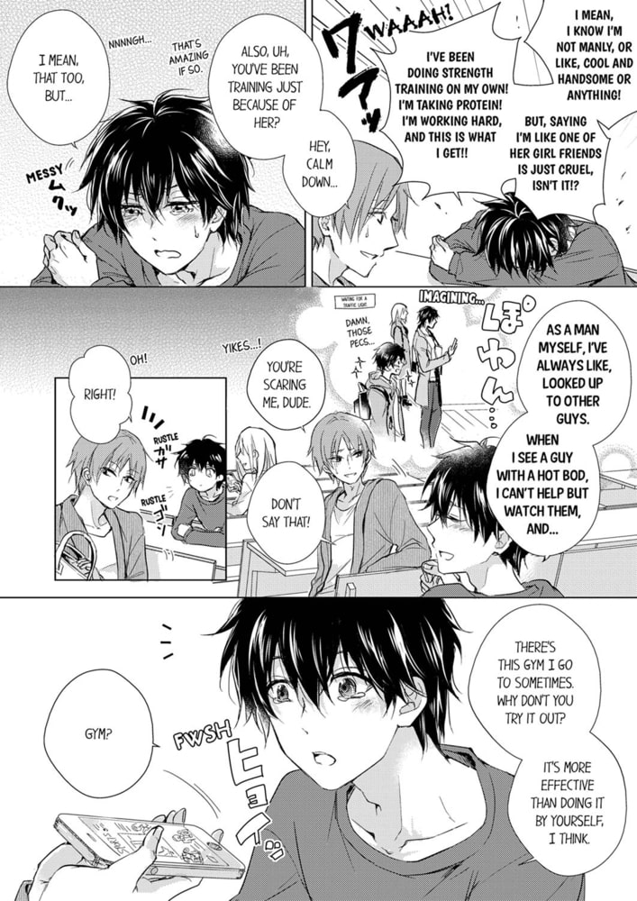 "You're so skinny, you look like one of my girl friends..." Rejected by the girl he likes, Yuto, at the recommendation of a friend, goes to the gym. There, he meets a hot personal trainer, Kyoya. In the middle of a personal training session, the sexy Kyouya plays with Yuto's chest, and Yuto's body temperature shoots up as the two come within kissing distance...! On top of that, he gets a boner, for some reason...! Kyouya, meanwhile, sits in bed thinking about how to win over the cute, but straight, Yuto... Thus begins the start of an intimate love training session between a straight college student and his gym trainer!