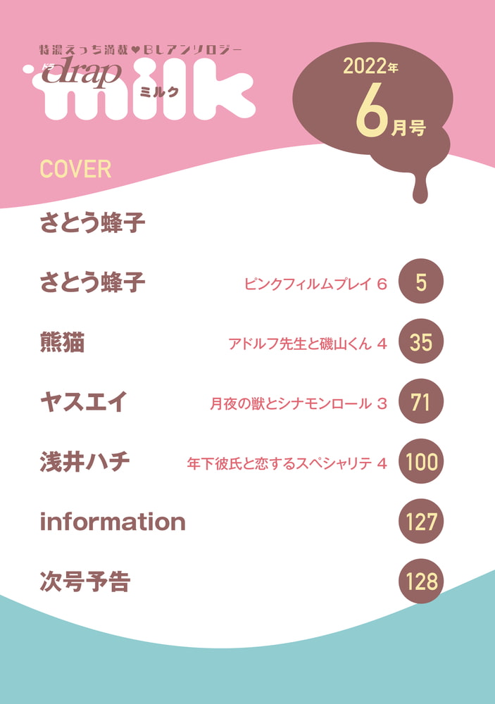 AV男優×AV監督の「ピンクフィルムプレイ」ハッピーエンド最終話☆ そのほか、教師×生徒/ケモ耳×ヒト/幼馴染×俳優など盛りだくさん!! drap milkはオール描き下ろしマンガで、ラブエロエッチ★読みごたえ大満足!! さとう蜂子「ピンクフィルムプレイ 6」──「拓海。もう一度、俺に君をくれ──」 人気タチ専モデル・新庄が出演するAVは全てバカ売れ。そんな新庄がAV監督・奥村を指名して撮影した《ハメられ撮り》が売上絶好調! AV演技の個人レッスンと称して、新庄とプライベートセックスを続けていた奥村だが、業界大手から新庄に専属契約のオファーが入る。奥村は受けるように薦めるも、モデルと監督以上の感情を抱いてしまい……。 熊猫「アドルフ先生と磯山くん 4」──「じょうず、気持ちいいいね、秋人のおくち──」 セックスお預けしてたら、浮気されちゃう?? 軽音部の磯山秋人は、英語教師・アドルフ先生とお付き合い中。個人レッスンの延長で、家に行けるほど親密になったけれど、キスだけで勃起してしまう秋人は、未だセックスは未経験。フェラや気持ちいいことはいっぱいされたけど、お預けばかりしてると浮気されると噂に聞いた秋人は心配になって──? ヤスエイ「月夜の獣とシナモンロール 3」──「離れないと、お前を襲ってしまう。俺はお前が大切だ──」 おじいさんを亡くし、ひとりぼっちになったトウリの前に現れたのは、真っ黒な衣装に身を包んだ男・ヨル。ふたりは同居生活を始め、楽しく暮らしていたけれど、実はヨルは人間にはない「発情期」があって──? 本能のまま、トウリを襲いそうになったヨルは、距離を取ろうとするが……。 キツネの獣人×人間の異種間ラブストーリー★ 浅井ハチ「年下彼氏と恋するスペシャリテ 4」──「ココナッツのローション、俺と使おうと思って?」「それ以外、ないだろ」 俳優の優貴は、ずっと好きだった年上の幼馴染・敬と「海外でデビューできたら付き合う」と約束し、海外ドラマで大成功! 恋人になった敬と、デートを重ね、キスだけじゃなく、フェラやその先も許されて…? だけど、「セックスはハタチになってから」という約束を守り、素股で気持ちよくなることに……★ カフェオーナー・敬と、俳優・優貴が、恋をしながら世界を旅するラブ・ジャーニー、今回の旅先はハワイ! 今月号は、さとう蜂子先生の「ピンクフィルムプレイ」より、新庄&奥村の描き下ろしイラストが目印★