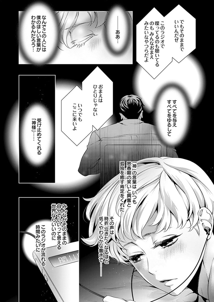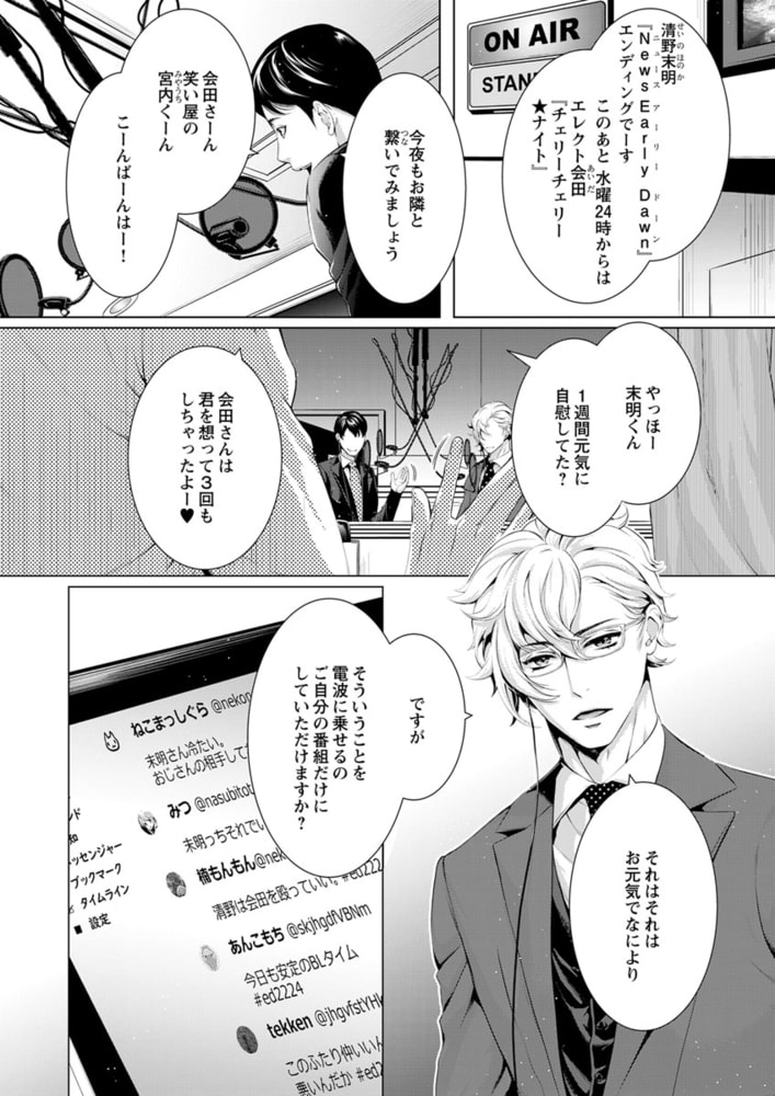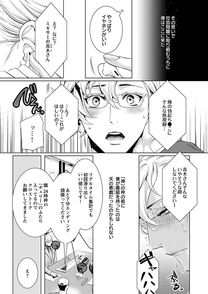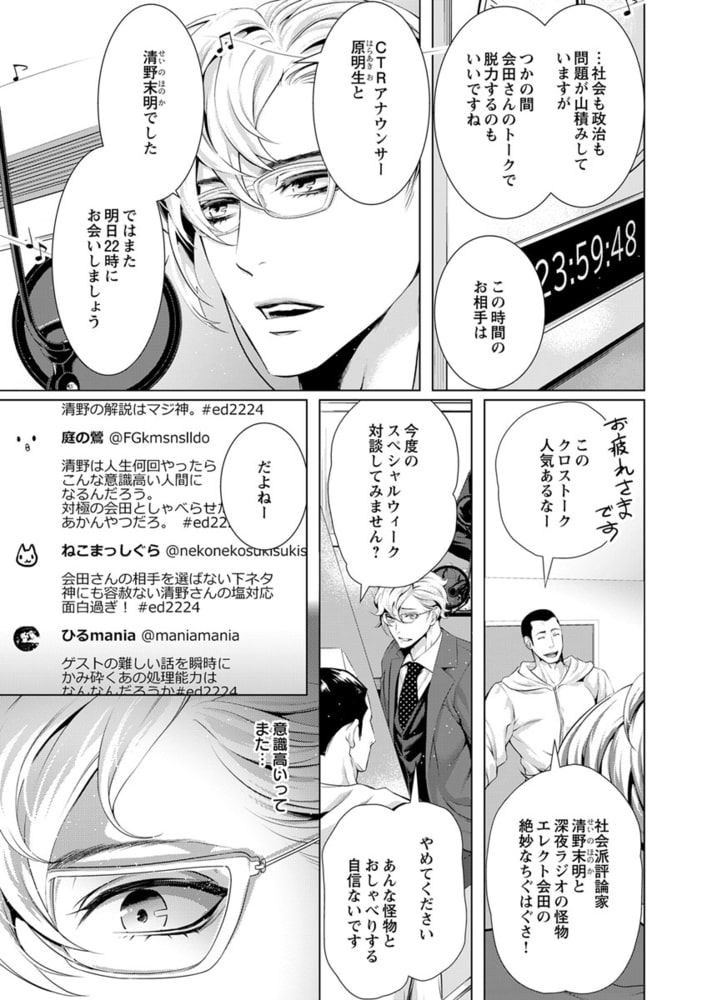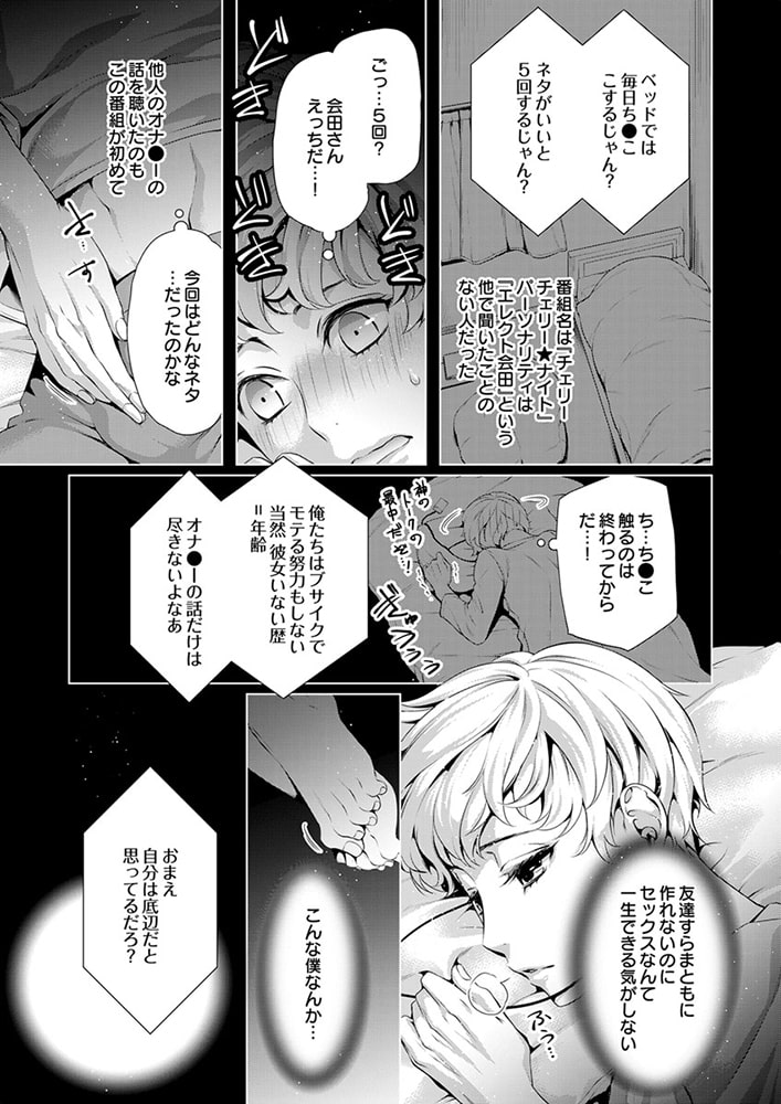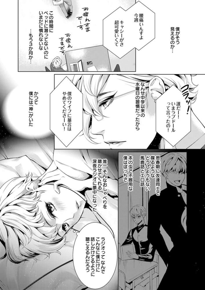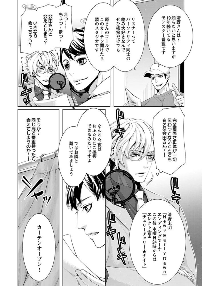 「俺の声に反応しちゃってるの? 俺が…欲しい?」社会派評論系ラジオ番組を持つ清野未明(せいの・ほのか)は、現代社会の問題を真摯に取り扱う人気パーソナリティ。クールで硬派なDJとして辣腕を振るう未明だが、実は19年にわたり、アダルトネタ満載の深夜の人気モンスター番組『チェリーチェリー★ナイト』のカリスマDJ・エレクト会田(あいだ)の大ファンでもあった。なぜなら会田は、孤独だった少年時代の未明にとって、たったひとりの「神様」だったから。
