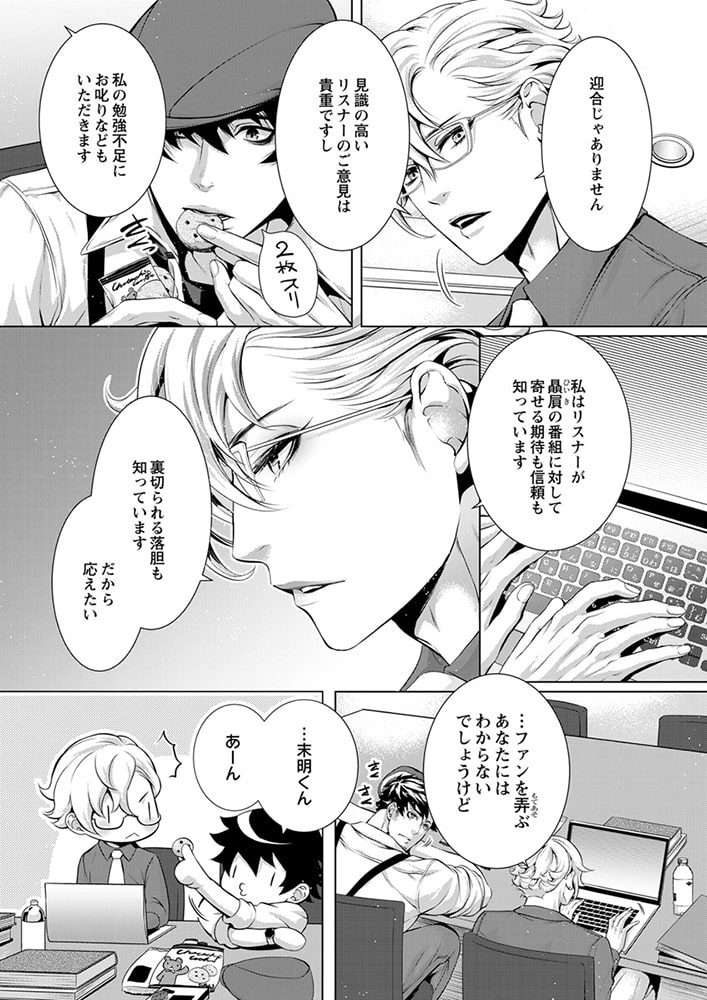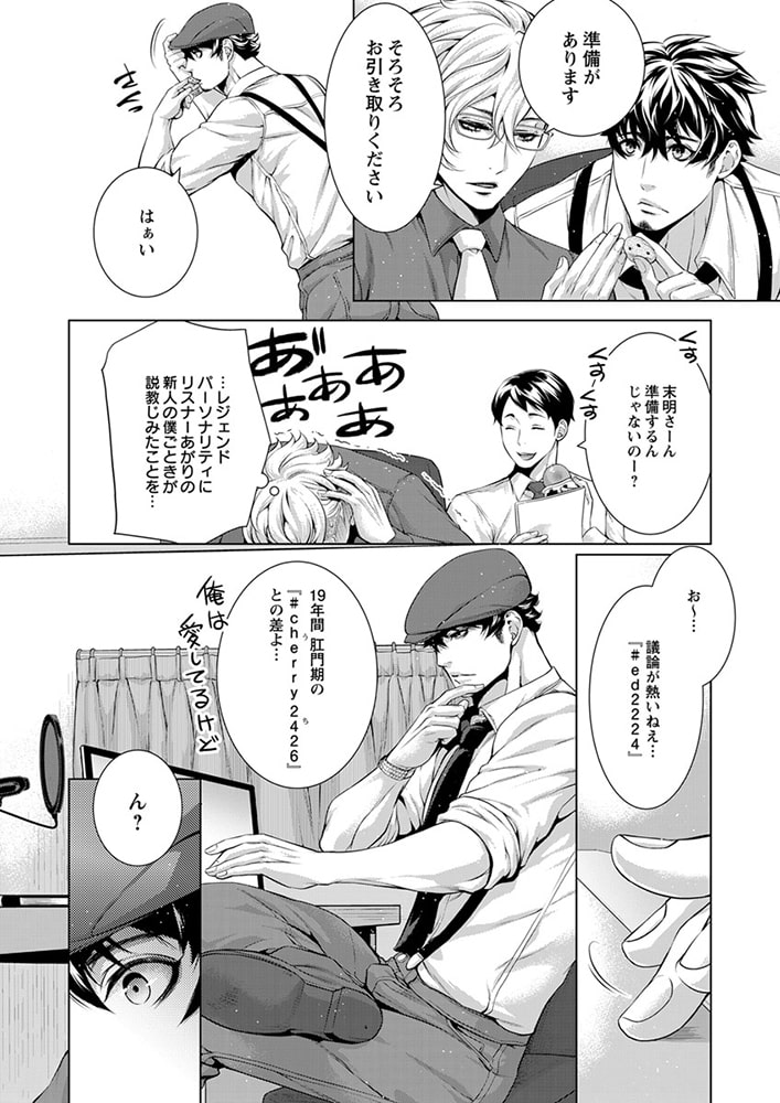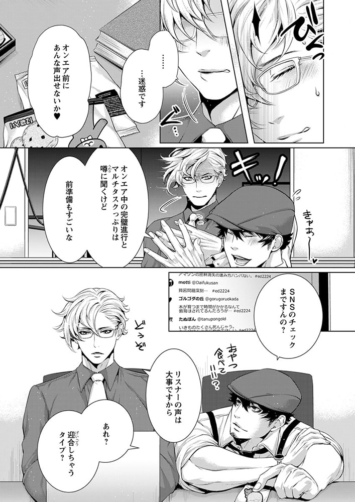 「俺の声に反応しちゃってるの? 俺が…欲しい?」社会派評論系ラジオ番組を持つ清野未明(せいの・ほのか)は、現代社会の問題を真摯に取り扱う人気パーソナリティ。クールで硬派なDJとして辣腕を振るう未明だが、実は19年にわたり、アダルトネタ満載の深夜の人気モンスター番組『チェリーチェリー★ナイト』のカリスマDJ・エレクト会田(あいだ)の大ファンでもあった。なぜなら会田は、孤独だった少年時代の未明にとって、たったひとりの「神様」だったから。