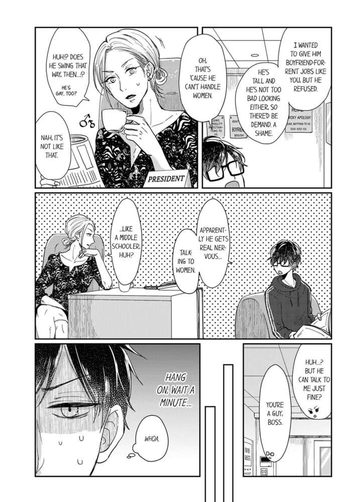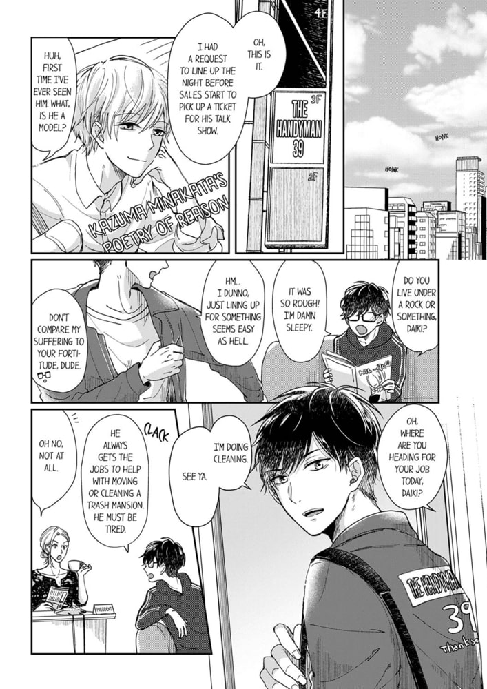 “Your face and your cock are just my type.” Though he’s a great-looking guy, university student Daiki has trouble talking to women because he was raised in a family full of brothers. Then, he receives a job as a handyman to clean the home of the highly popular model, Kazuma! Far from the usual shining prince he impresses upon people, Kazuma is a full-fledged slut with a sharp tongue to match, and he sets his sights on Daiki. Devilishly sexy, he bribes Daiki with sex to keep his mouth shut! Daiki can’t keep his eyes from Kazuma, who shows his true colors only to him like a coy kitty cat, nor can he leave that easily turned-on and erotic body…