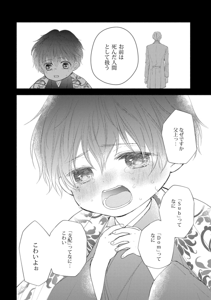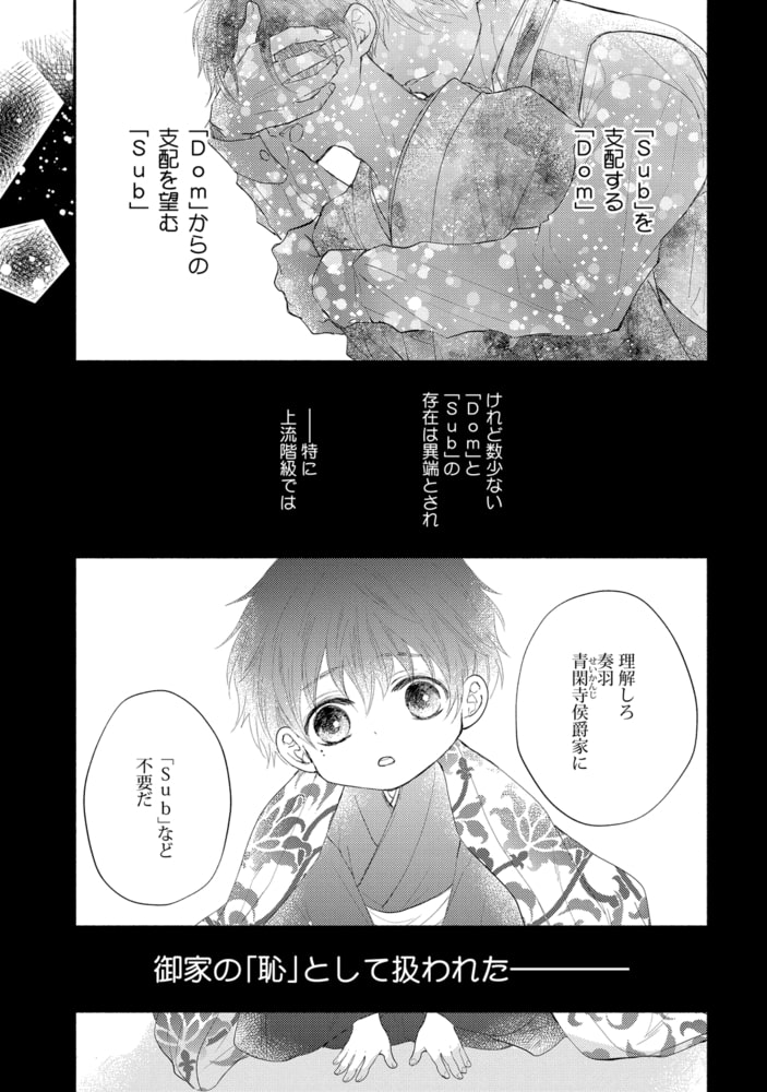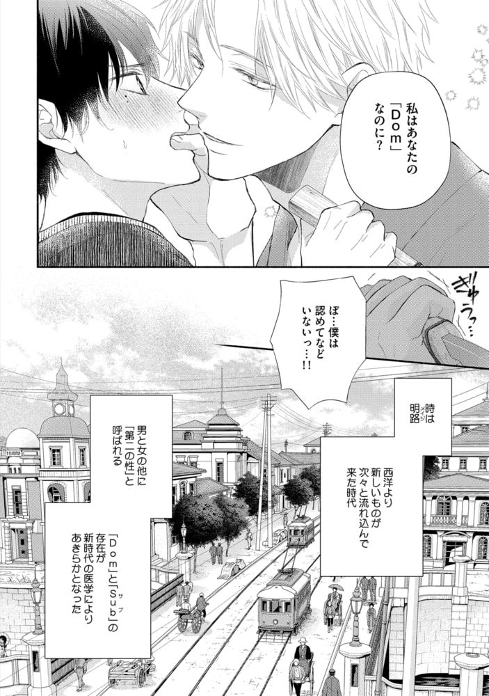 時は明路(メイジ)。西洋より新しいものが次々と流れてきた時代――医学もまた進歩し男女の他に「第二の性」と呼ばれる「Dom」「Sub」の存在が明らかになった。 「Dom」…支配したい。 「Sub」…支配されたい。 そんな欲望を抱えながら生きている彼らは少数派であり、異端とされ蔑視されるようになる。中でも上流階級においては、家の「恥」として扱われ、世から隠れるように生きていた―― 侯爵家の青閑寺奏羽は「Sub」の性を持ったことで、父から蔑まれ別邸で身を隠すように生活していた。そんなある日、父から定期的に送り込まれてくる「Dom」の男として、男爵家の一条国哉がやってくる。自身の矜持から気丈に振る舞っていた奏羽は、いつものように追い返そうとするも国哉の押しが強いくせに優しい態度に翻弄されてしまう。彼の甘いお仕置きに「Sub」としての本能が抑えられなくなった奏羽は身を任せてしまい…??