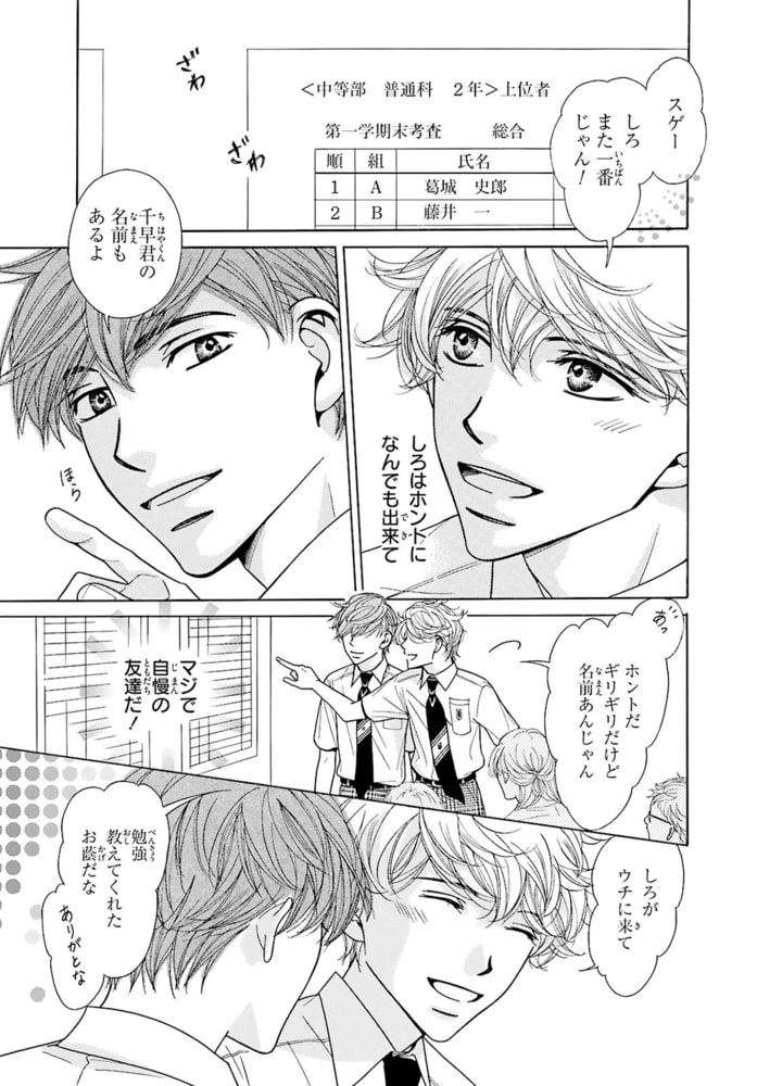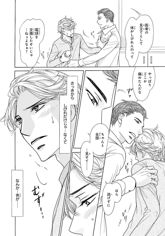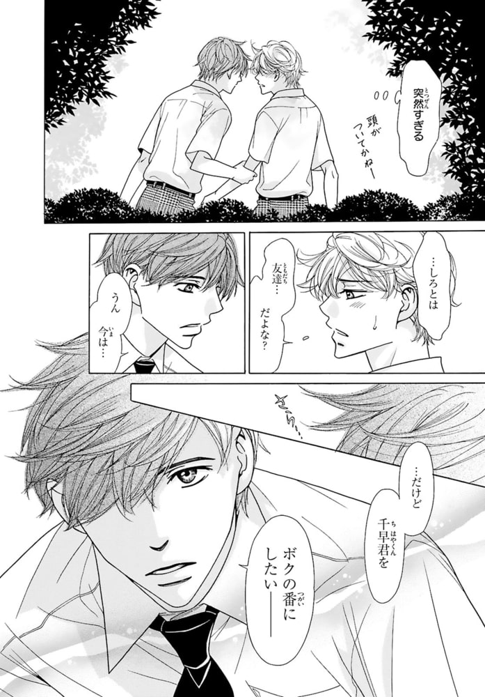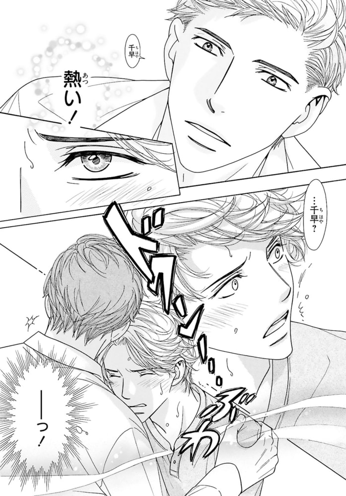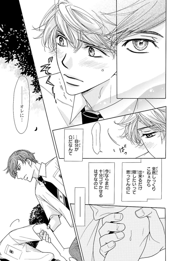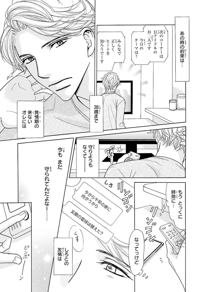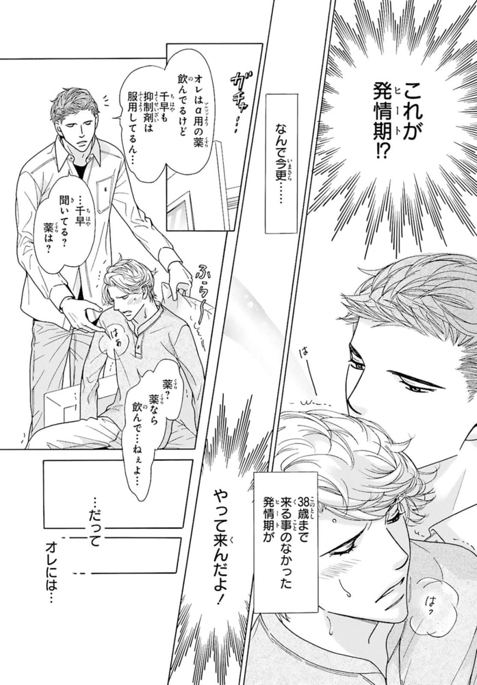 おじさんΩ、38歳にして初めての発情!?αの親友を前に体の奥が反応し――。中学の時に「発情期が来たら僕の番になって?」と幼馴染で親友のしろ(α)にプロポーズされた千早(Ω)。しかし…それから24年、発情期は来ないまま38歳に。しろとは相変わらず友達だが、『あの約束は時効だろう』と思っていた。それなのに…ある日突然しろの前で発情期が来てしまい!?人生初の発情期に快感を求め乱れる千早。その姿を見て、しろは「いい匂いだ」と千早のを扱き出し!?部屋中に広がるフェロモンと響くいやらしい音。更には、千早のナカがしろの熱いモノを欲して疼き出し…。約30年の片思いが動き出す――。