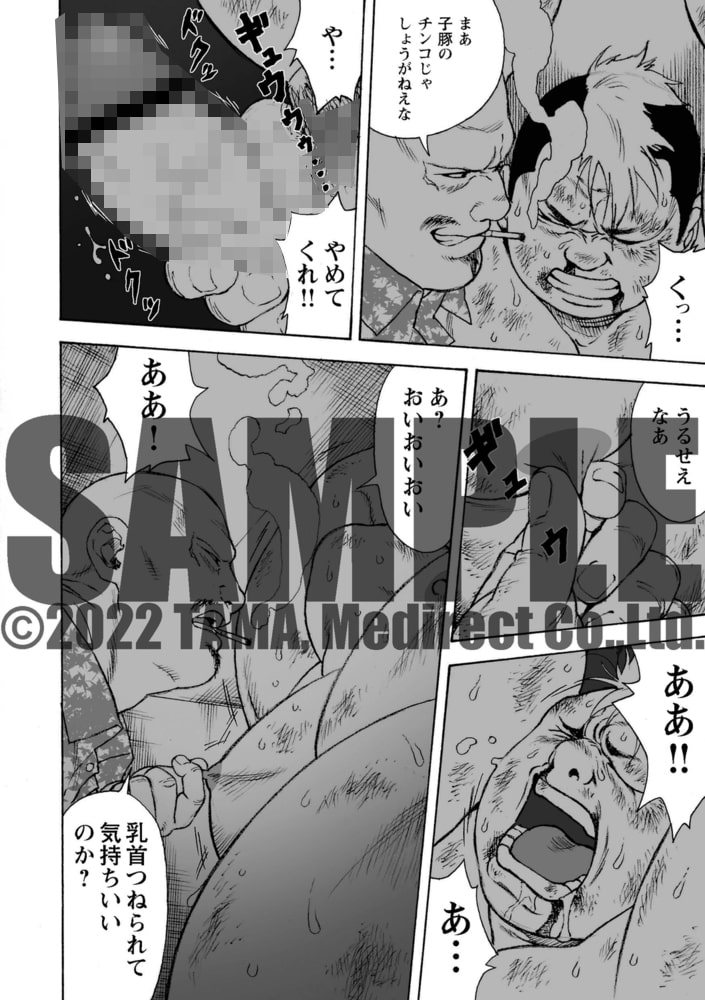 恥ずかしさと悔しさで身悶える若デブ。ヤクザはいやらしい笑みを浮かべ、彼の乳首やサオを、足やタバコやナイフで弄ぶ…囚われた若デブの運命は…?