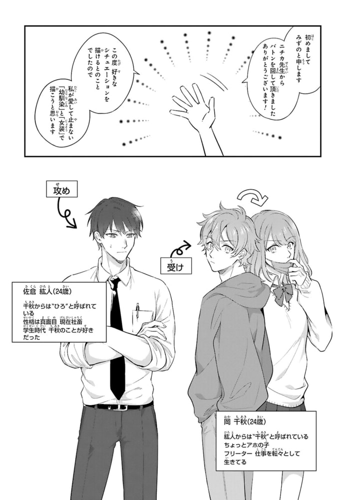 モバイルBL宣言発のリレー企画!BL作家ならではのこだわりを存分に詰め込んだショートマンガをお届けします。当企画では先生方が“萌える…!”と感じるキャラや関係性、シチュエーション等をふんだんに詰め込んで、ストーリーのクライマックスのみを抜粋しました!!人気作家の性癖がぎゅっと凝縮された作品が読めるのは『いきなりCLIMAX!』だけ☆ 執筆陣は毎回変わるのでお楽しみに!