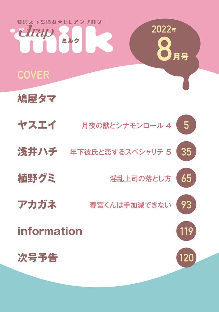 溺愛がいっぱい☆欲求満たされラブたっぷり☆ ケモ耳獣人×ヒト/幼馴染×俳優/バリタチ部下×淫乱上司/生徒会長×副会長etc……萌え属性が盛りだくさん! drap milkはオール描き下ろしマンガで、ラブエロ・エッチ★読みごたえ大満足!! ヤスエイ「月夜の獣とシナモンロール 4」──「ずっと我慢していた。お前に触れたい──興奮している」 おじいさんを亡くし、ひとりぼっちになったトウリの前に現れたのは、真っ黒な衣装に身を包んだ男・ヨル。そんな彼は、人間にはない「発情期」があって??トウリにだけ「欲情」してしまうヨル。そして、トウリは「襲ってもいいです!」と伝えて──…。キツネの獣人×人間の異種間ラブストーリー★ 浅井ハチ「年下彼氏と恋するスペシャリテ 5」──「全部、俺のものにしていいの?」「とっくに、そうだよ──」 俳優の優貴は、ずっと好きだった年上の幼馴染・敬と「海外でデビューできたら付き合う」と約束し、海外ドラマで大成功! 恋人としてデートを重ね、キスだけじゃなく、フェラや素股もしたけれど、『セックスはハタチになってから』という約束があって──。そして、ついに誕生日の日を迎えたふたりは、海の見えるホテルで……!?長年の恋が成就する、ラブラブエッチ回☆今回の旅先は沖縄! 植野グミ「淫乱上司の落とし方」──「経理部の鬼がデリヘルなんてびっくりですよ!」「どういうつもりだ──」 昼はエリートリーマン、夜は男相手のデリヘルをしている蓮見主任。その秘密が、営業部の若手ホープ・東間にバレてしまった…!黙っている代わりに、一夜の相手をすることになったが、東間の生意気にでかいモノをしゃぶってるうちに、自身の淫乱さを暴かれてしまい──?バリタチ部下×淫乱上司の下克上ラブ☆ アカガネ「春宮くんは手加減できない」──「なぜ、俺を指名した?」「お前が俺を見てたから。好きなのか?」 学園の人気者で、カリスマ性もオーラもある春宮は、誰もが惹かれる男。白石もまた、彼にずっと恋をしていた。そんな春宮が生徒会長に立候補し、ぶっちぎりの一位当選。さらに春宮の采配で、白石が「副会長」に指名されることに!これまで接点がなかったのに、ずっと一緒に行動することになり、ドキドキがおさまらない白石は……?生徒会長×副会長の、甘酸っぱい学園ラブストーリー! 今月号は、鳩屋タマ先生の「猫とスピカ」より、福永&シーナの描き下ろしきゅんかわイラストが目印★ コミックスdCDX「猫とスピカ1~5」は大好評配信中!!