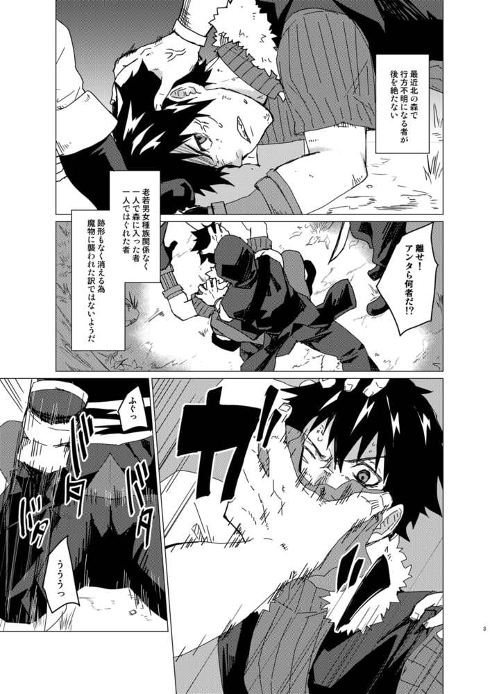青年が優勢だったが卑劣な手により敗北、そのまま二人の獣人に犯され気を失う。