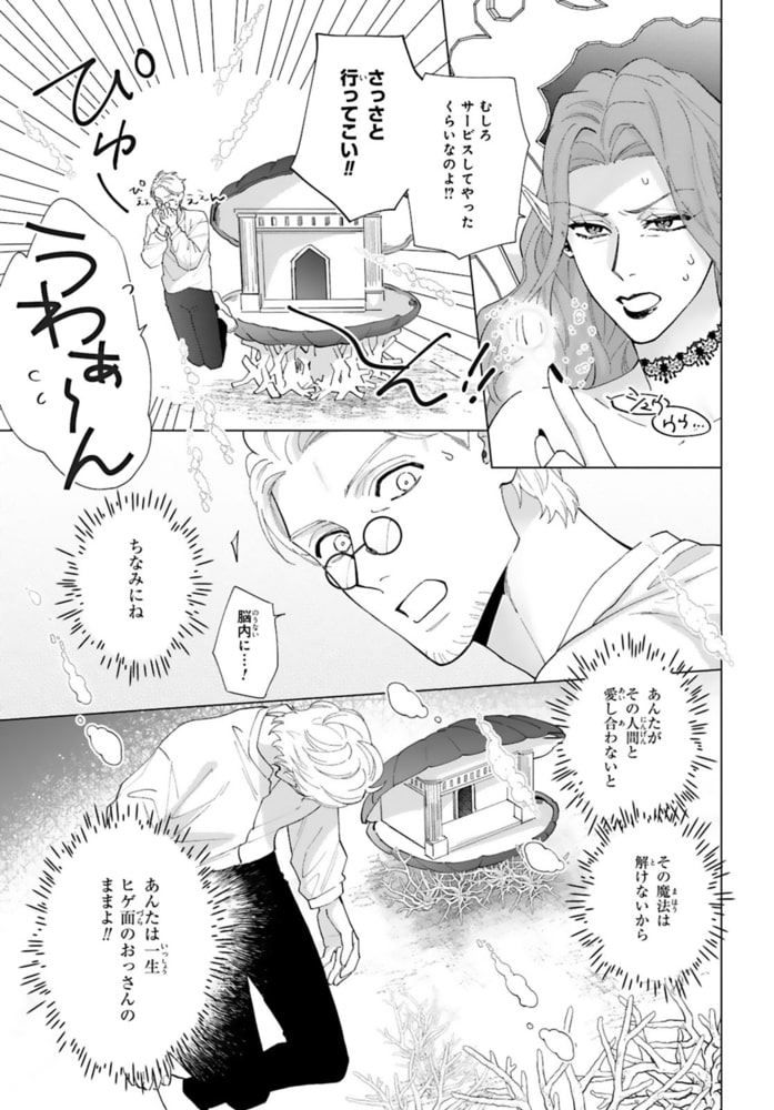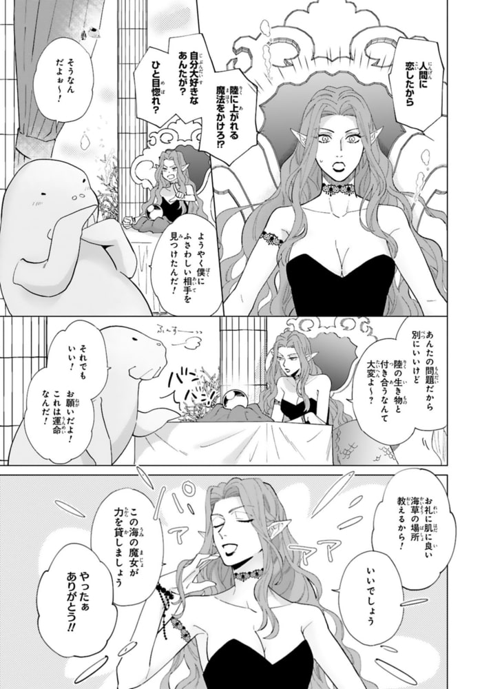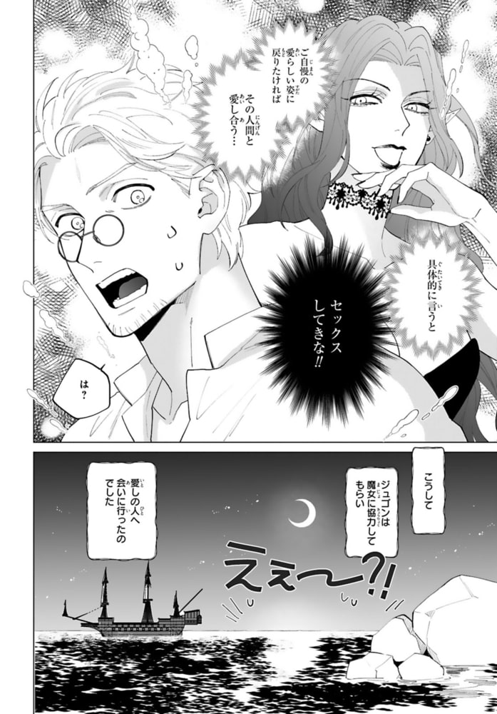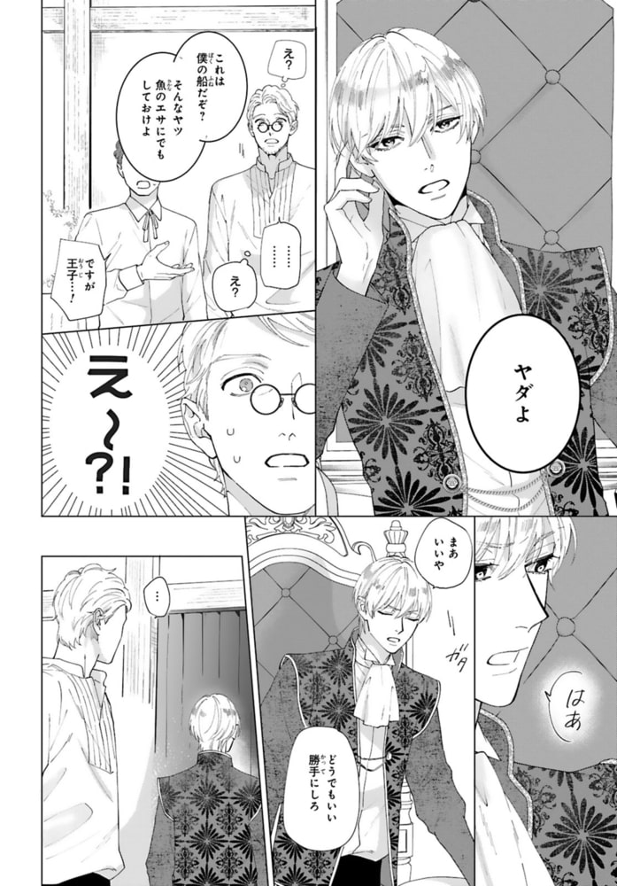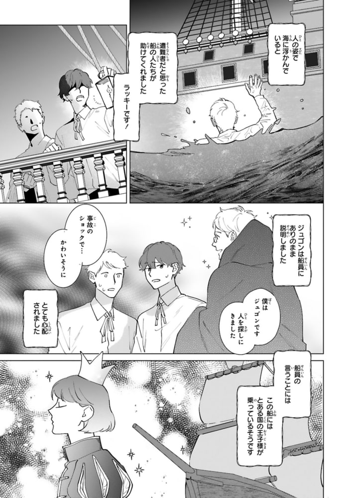 「僕たちはつがいになるべきだ!!」とある海に住む世界一可愛いジュゴン(自称)が、船上の美しい王子様に一目ぼれ!?王子に会うべく魔女に頼み込んで人間の姿にしてもらったけど、全然可愛くないおじさんにされてしまう!元の姿に戻るには王子とのセックスが必須だと言われ、仕方無しにおじさん姿でジェイと名乗り陸に上がることに。運よく王子と対面出来たジェイだったけど、好きになった王子は見た目だけの超わがまま男なことが判明。使用人達へのあまりの態度に幻滅していたが、その日の夜、一人で涙を零す王子を見てしまい――?