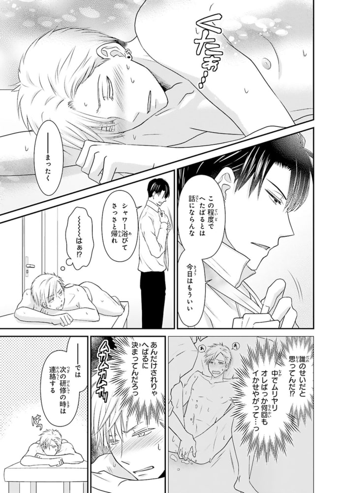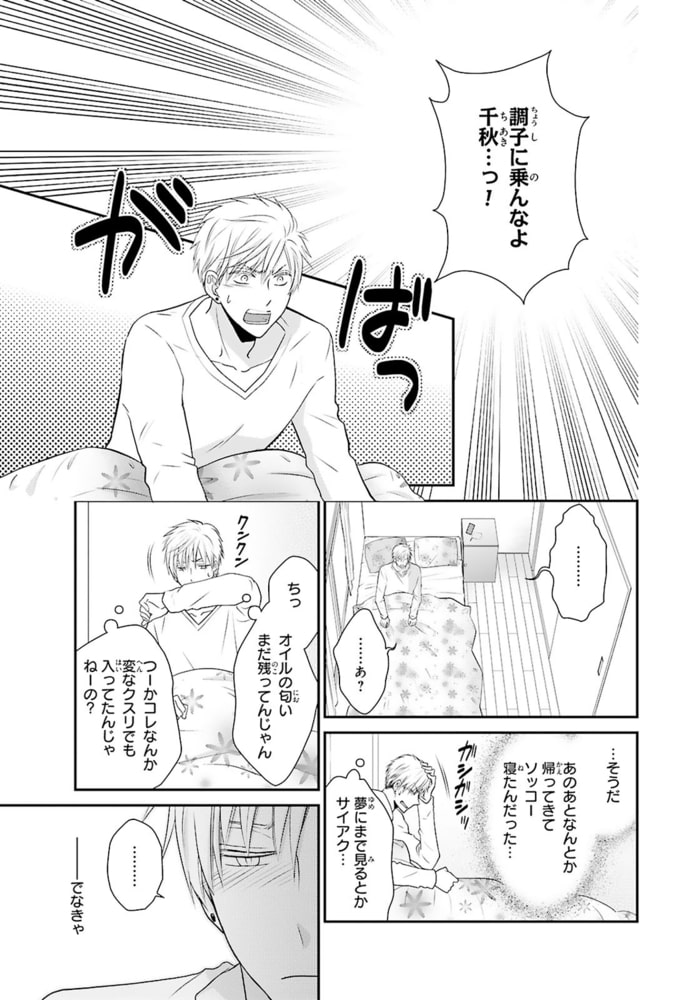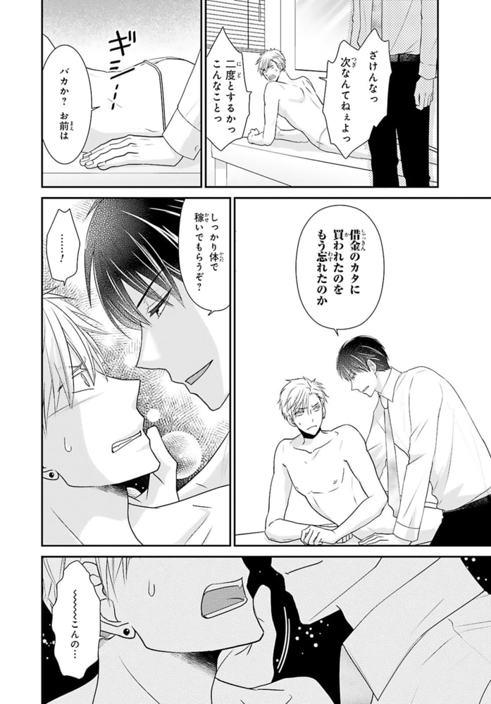 ギャンブルで借金500万円を抱えるヒモの航。ついに取立屋に捕まり、返済する金もなく絶対絶命…と思ったら、偶然にも再会した従兄弟・千秋が借金を代わりに払ってくれて!?どうやら千秋は幾つも会社経営をしているらしく、金には困ってないという。返済してもらったことに味を占めた航は、優しい千秋に付け込んで更に金を巻き上げようと画策するも、「誰が無償で立て替えると言った?」千秋の態度が一気に豹変!!肩代わりした500万円を返済するため、千秋が新規事業としてオープンするマッサージ風俗で働くことになってしまう!従兄弟直々の風俗研修により、乳首から前立腺まで…ありとあらゆる場所を開発されて!?