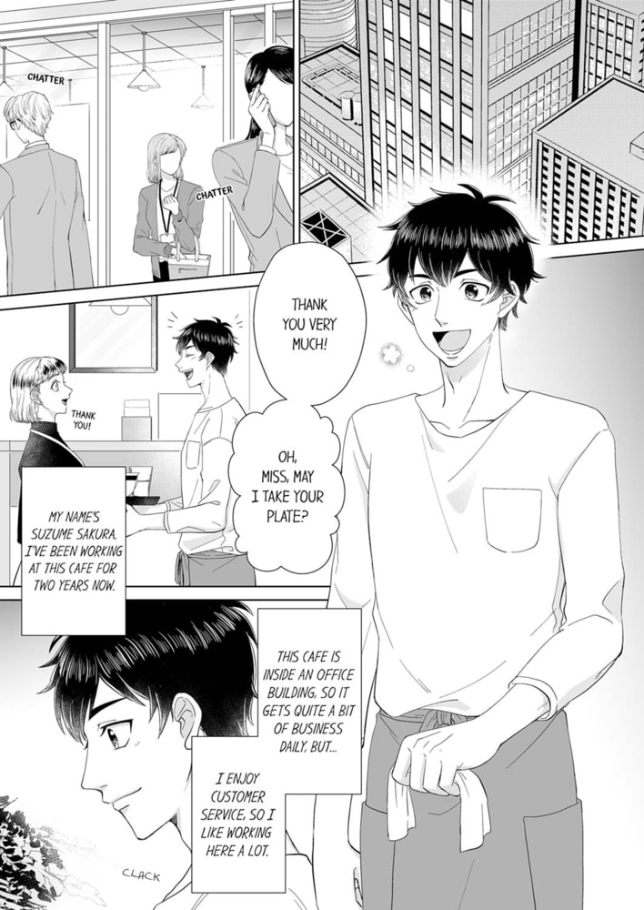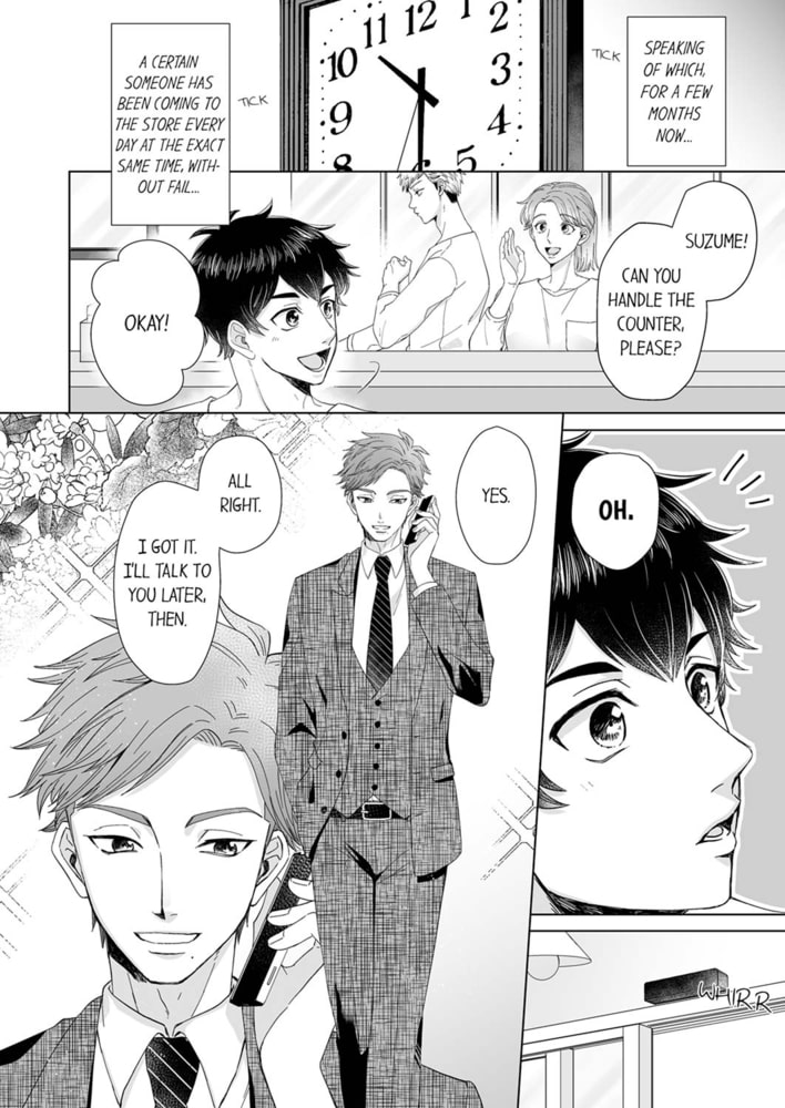 “Maybe I’ll have you fall into me, Suzume.” Suzume, a clerk at a cafe, receives a business card from one of his regulars, a handsome businessman by the name of Miyaji. Not only that, but Suzume’s coworker tells him he thinks Miyaji has a thing for him! Not willing to just take being made fun of by a hot guy like that, Suzume decides to fight back…!! The next day, Suzume gets touchy-feely with Miyaji, but that doesn’t change Miyaji’s mature demeanor… or so he thought. At night, when it’s just the two of them at the cafe, a sudden passionate gaze and an intense kiss make Suzume’s hips ache sweetly…