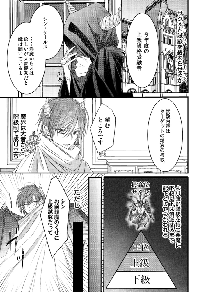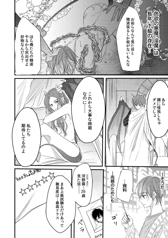 「この男、なんでイかないんだ…!?」――上級試験のため、下界に降りてきた淫魔・シンは、精液を搾取するべくターゲットを探していた。その人物とは、モサい見た目に反して難易度最高クラスの精力を持つ男・河野葵。本当にコイツが最高クラス…?と疑問に思うも、たまたま通りがかった河野を無理矢理ホテルへ連れ込むことに成功する。チャンスとばかりに、色仕掛けで迫りやらしくご奉仕するシン。しかし逆上した河野に突然組み敷かれ、めちゃくちゃにイかされてしまい…!?「コイツから精液なんか搾取できるわけないっ!」この男の正体とは――?