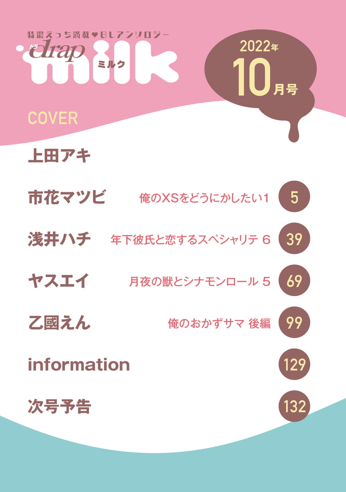 祝・drapmilk 創刊10周年!!! ありがとう★ drap milkはオール描き下ろしマンガで、ラブエロ・エッチ★読みごたえ大満足!! 市花マツビ「俺のXSをどうにかしたい 1」──「俺には誰にも言えない秘密がある。それは……」── 市花マツビ・新連載スタート!!!人気ファッションモデル・朋には誰にも言えない秘密がある。それは《アソコが小さい》こと…! そんなXSサイズにコンプレックスを持つ朋の秘密が、同僚モデル・成にバレてしまった。しかも、成は服の上からでもわかる巨根の持ち主で……!? 秘密を共有した二人は、前立腺を刺激させてアソコを大きくする練習をすることに──。正反対な二人の《チントレ》から始まるハッピー・ラブストーリー! 浅井ハチ「年下彼氏と恋するスペシャリテ 6」──「こーゆーの新婚ぽくて嬉しい」「……ばか」…お互い浮かれてるな── 俳優の優貴は、ずっと好きだった年上の幼馴染・敬と「海外でデビューできたら付き合う」と約束し、海外ドラマで大成功! 恋人としてデートを重ね、キスだけじゃなく、フェラや素股もしたけれど、『セックスはハタチになってから』という約束があって──。そして、ついに誕生日の日を迎えたふたりは、はじめて身も心も繋がり合う★ そんな二人のラブラブ最高潮なクライマックス最終話! ヤスエイ「月夜の獣とシナモンロール 5」──「ずっと想像していた。この手の体温を、感触を──」 おじいさんを亡くし、ひとりぼっちになったトウリの前に現れたのは、真っ黒な衣装に身を包んだ男・ヨル。そんな彼は、人間とは違い「発情期」のあるキツネの獣人だった…! トウリにだけ「欲情」してしまうヨルは、怖がらせないように距離を取るも……? 二人の愛が結ばれるラブ成就回! キツネの獣人×人間の異種間ラブ★ 乙國えん「俺のおかずサマ 後編」──「同僚の口の中にぶちまけることで頭がいっぱいなんでしょ?」 デザインセクションリーダー・木浪の楽しみは、リモート勤務中にオナニーすること…! 今日もおかず(AV)でオナっていたら、リモート相手の進行管理マネージャー・清澄が、AVと重なって見えてしまった。そんな清澄を抱く妄想で、オナニーが止まらない木浪だったが、なんとカタブツだと思っていた清澄はド淫乱で、遠隔フェラでイカされまくってしまう★ 充実した下半身生活だけど、飽きられてしまうのではと不安になった木浪は…? 今月号は、10周年お祝い! 上田アキ先生の大人気「恋が満ちたら」より、菱本&伊瀬の美麗描き下ろしイラストが目印★ dCDX「恋が満ちたら」は大好評配信中!! (上田アキ先生は表紙のみの掲載です)