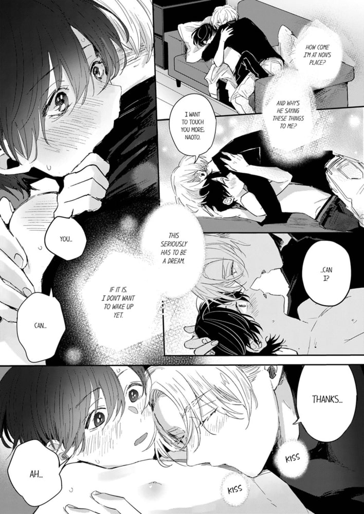 Rookie actor Naoto joins a theatrical company following the actor he admires, Non. Moreover, he was chosen to play the role of this lover in their new boys love performance! The characters are "lovers," so there are kiss scenes in the play. He's too nervous to act a kissing scene with the troupe's poster actor well...!!! Nonomiya wants to help him, and proposes that they treat each other like lovers until the performance. Since then, he's been overly sweet and kind... but when they practice kissing, he comes on to Naoto with such wild seductiveness that he feels as if he's going to be "devoured". Seeing Non's manly expression for the first time lights Naoto's body on fire... The way he bites his tongue and sucks on it during kissing, his burning gaze... the curtains to a time-limited love open.