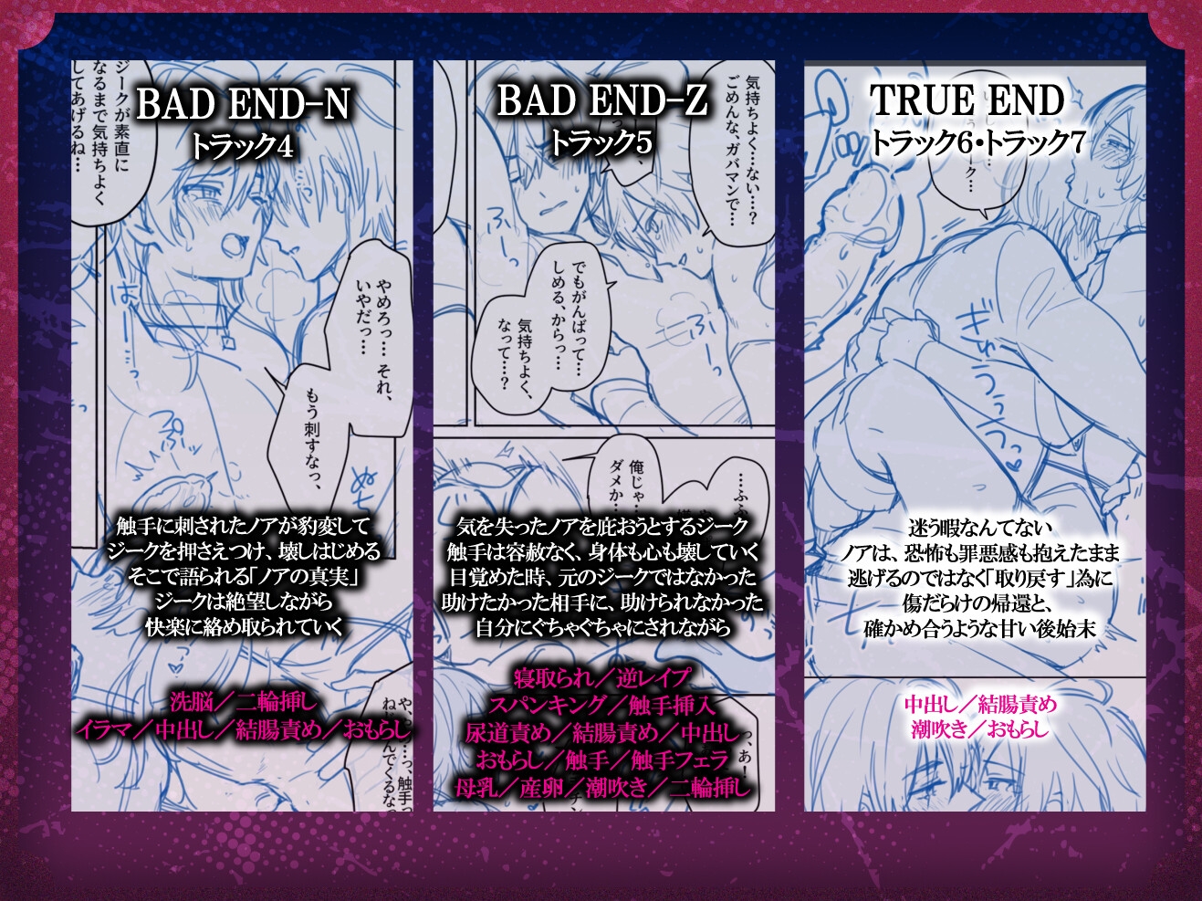寝取られ/逆レ○プ/スパンキング/触手挿入/尿道責め/結腸責め/中出し/おもらし/触手/触手フェラ/母乳/産卵/潮吹き/二輪挿し