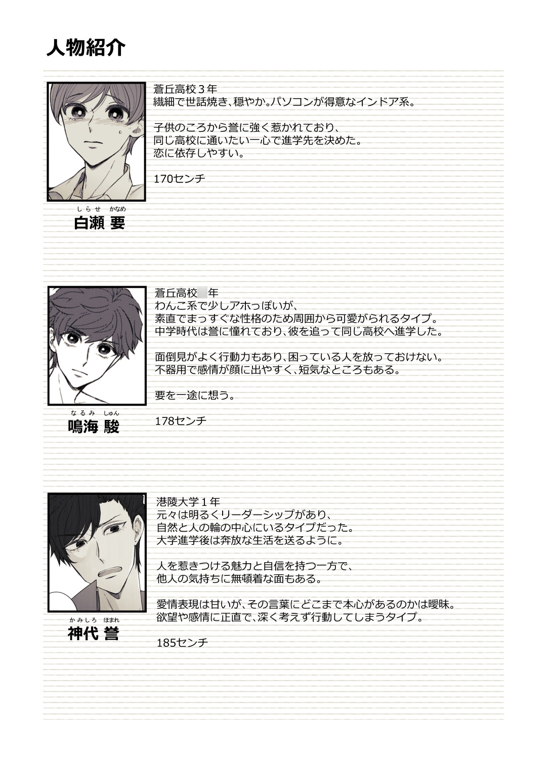 「またやってしまった」 見慣れぬ天井を仰ぎながら、白瀬要は独りごちた。 隣にいるのは、恋人じゃない。 ――なのに、また。 連鎖していく不毛な関係。 終止符を打てるのは…… 56頁