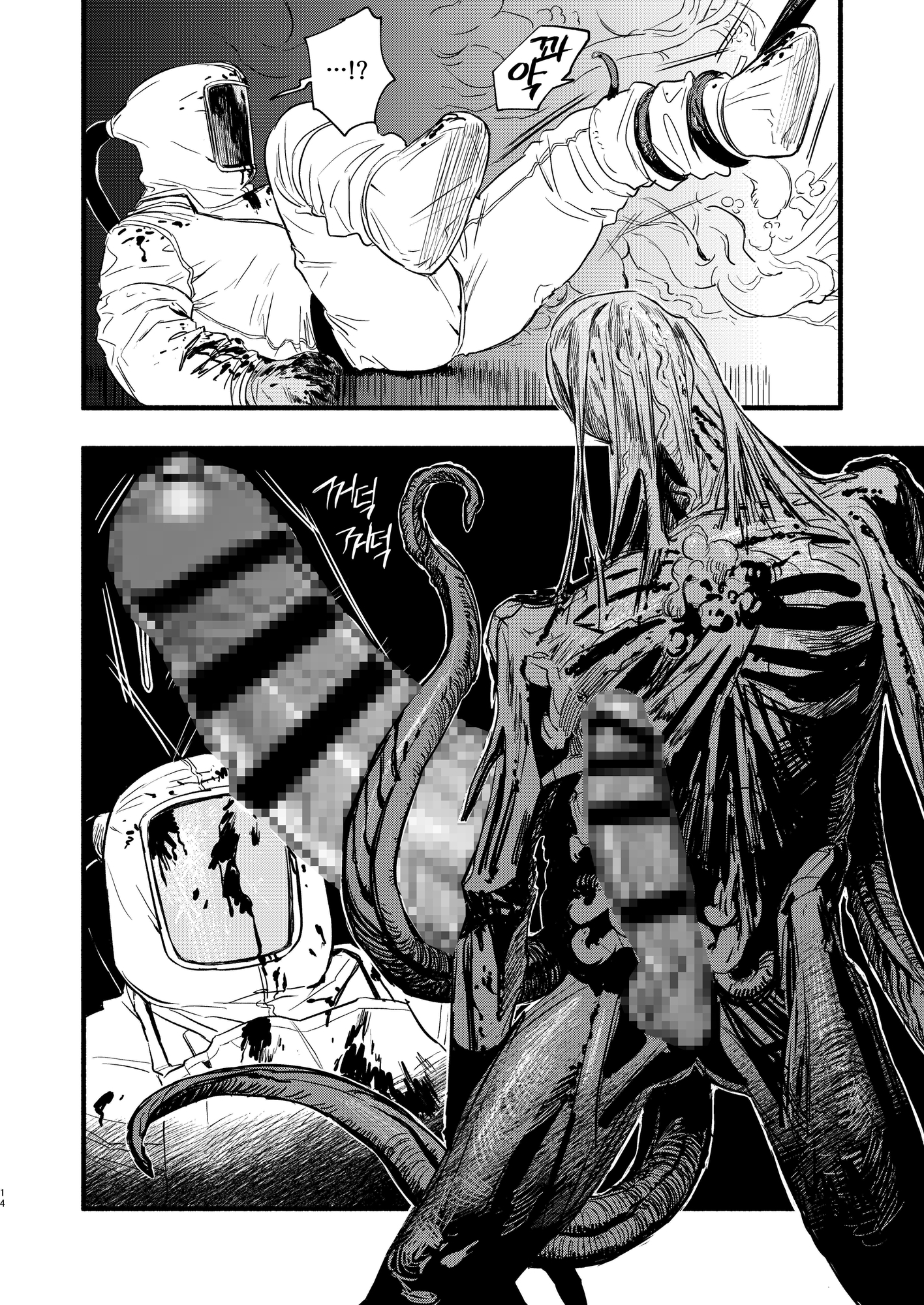 防護服を着たモブ研究職員がクリーチャーに犯されるR18漫画です。