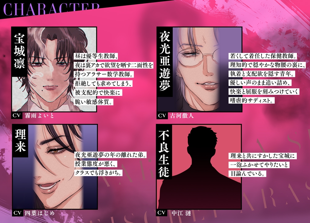 若くして着任した保健教師。理知的で穏やかな物腰の裏に、執着と支配欲を隠す青年。