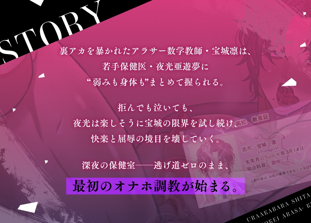 弱みを握られた瞬間、夜光の支配から逃れられず、羞恥と快楽で壊れていく体質が露呈する。