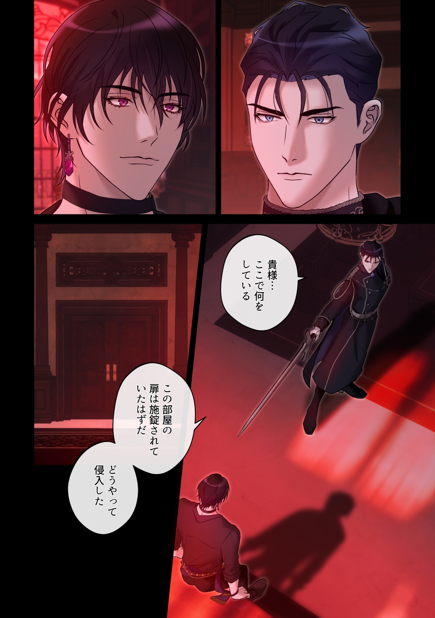 剣を突きつけるダリウスだったが、カリールは余裕の笑みと共に間合いを詰め、圧倒的な力で彼を執務机へと押し倒す。