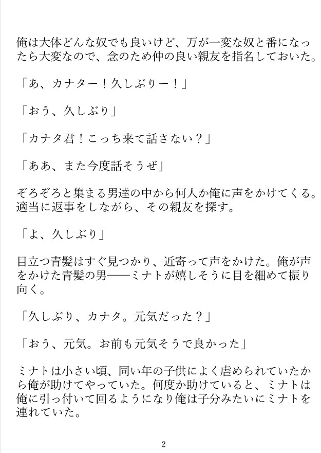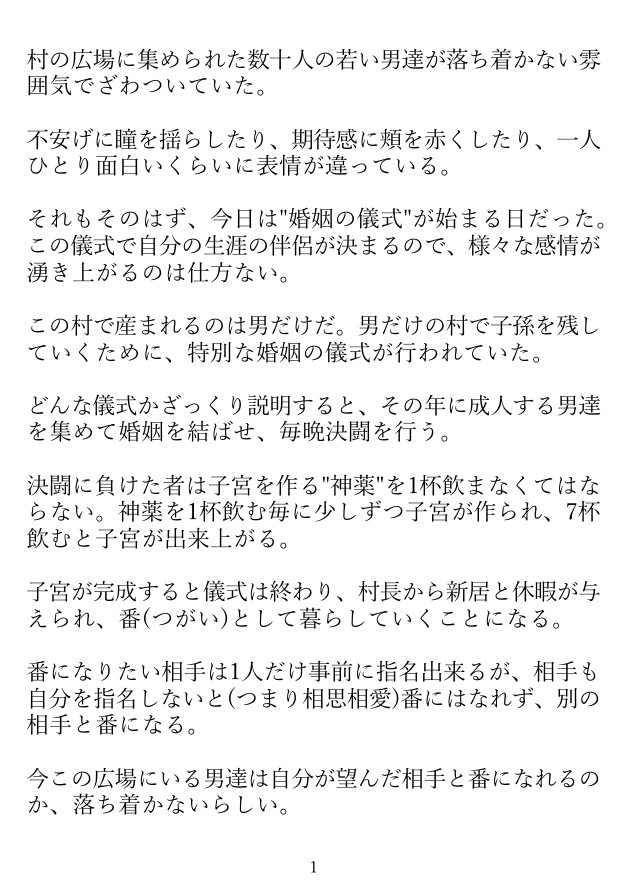 男しか産まれない村で、幼い頃からの親友と婚姻を結んで子宮を作る話です。