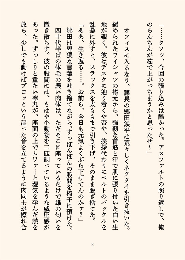 ムワァ…と漂う男臭さ、汗ばんだ肌の質感。「ぶるんッ」「ユサッ」「ぶらぶら」と重力に従って揺れ動く巨大な股間の描写にこだわりました。