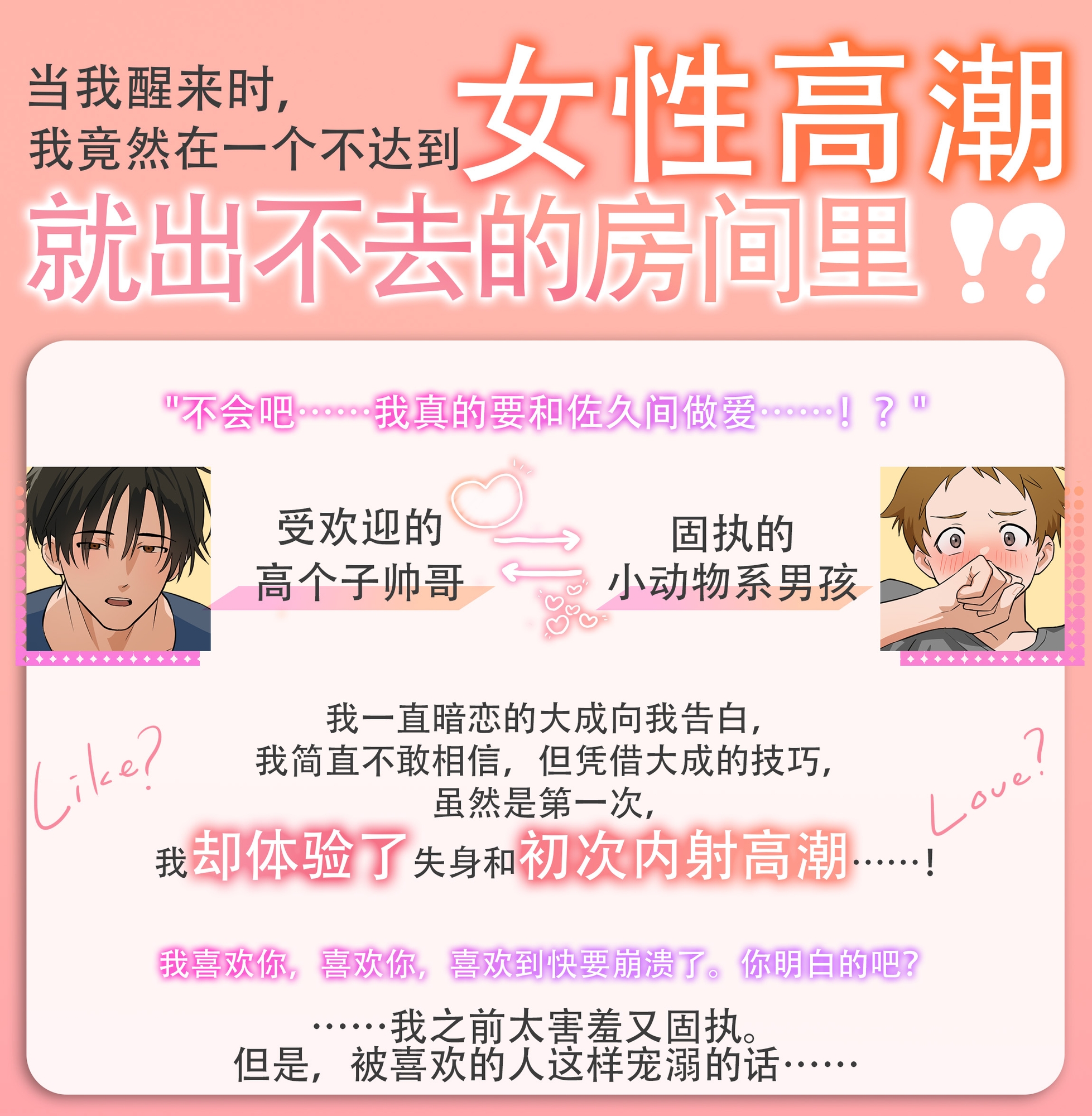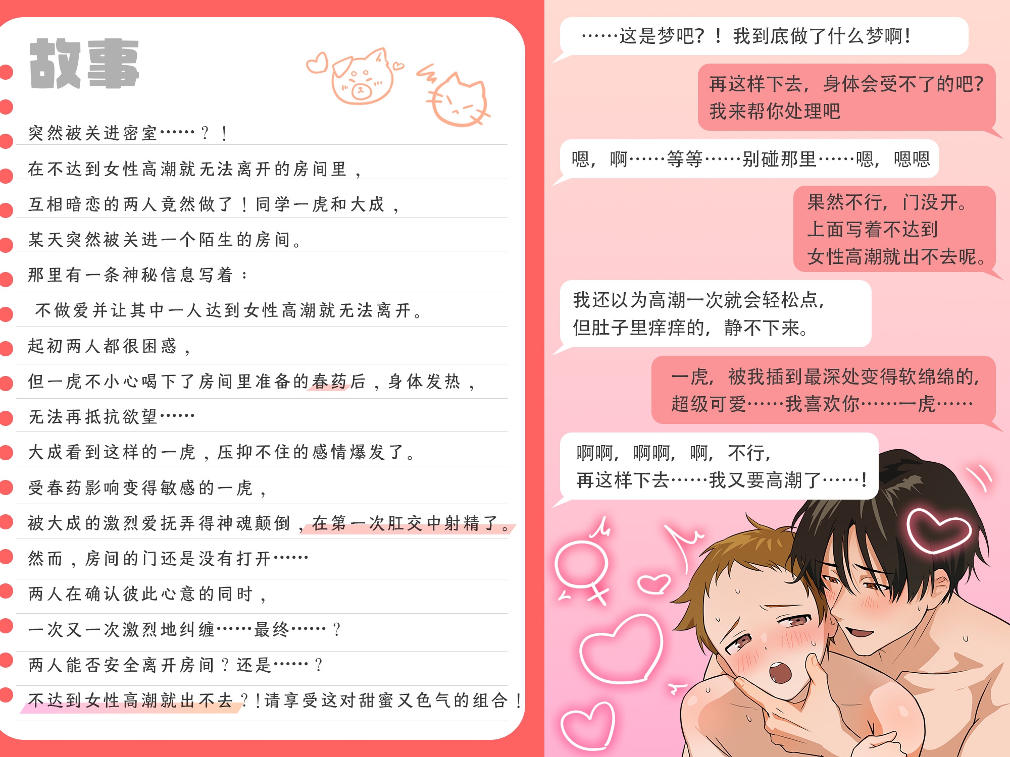 同班同学一虎和大成某天突然被关进了一个陌生的房间。那里有一条神秘的信息写着:“不做爱并且其中一人达到女性高潮就无法离开。”