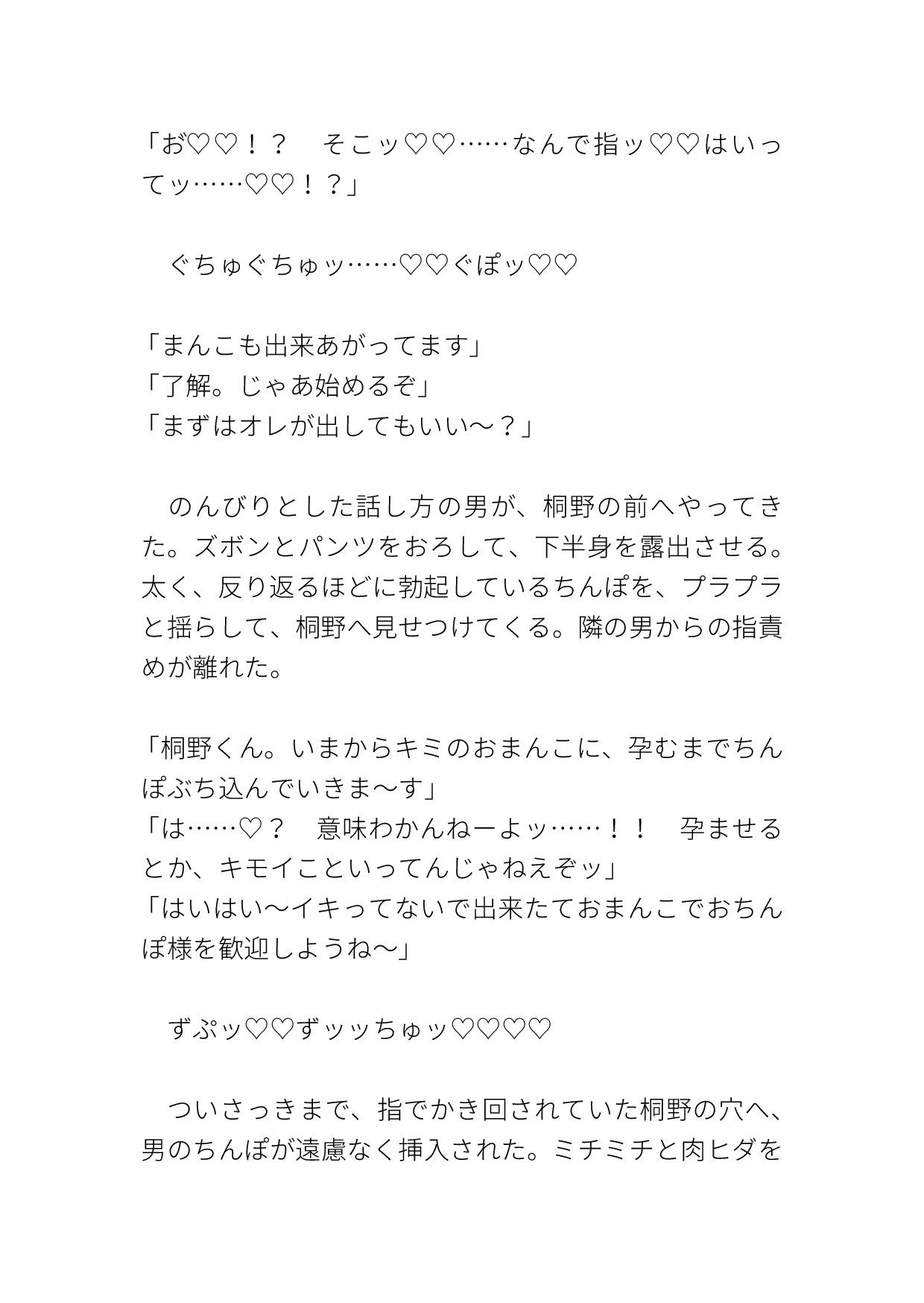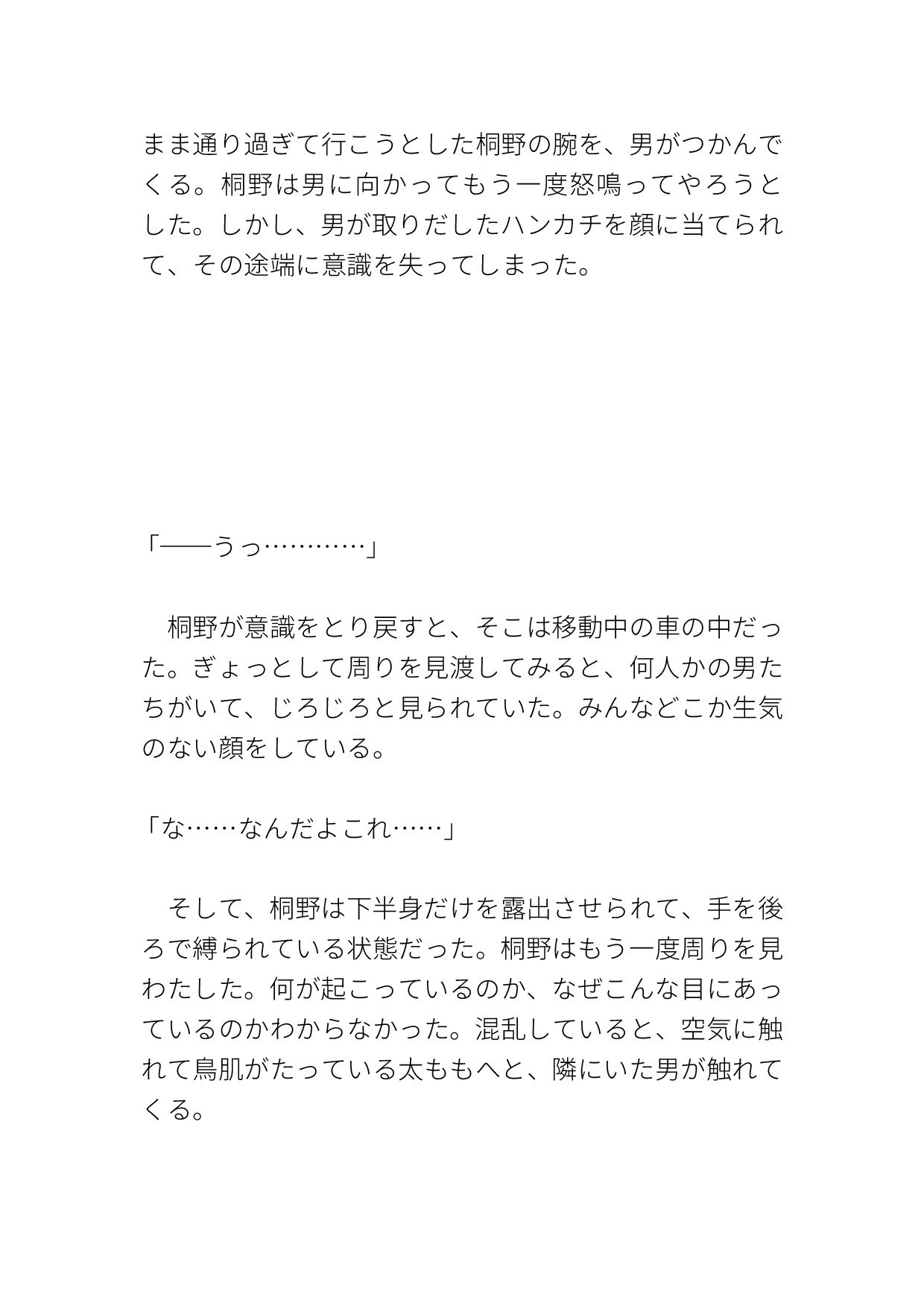 車内で中出しされたあと、気絶している間にどこかの部屋へ連れていかれる。そこで男たちからマワされ、中出しされまくる。
