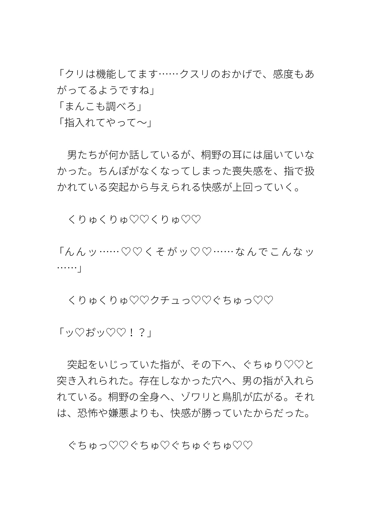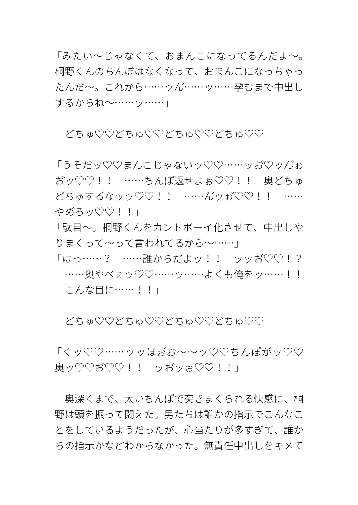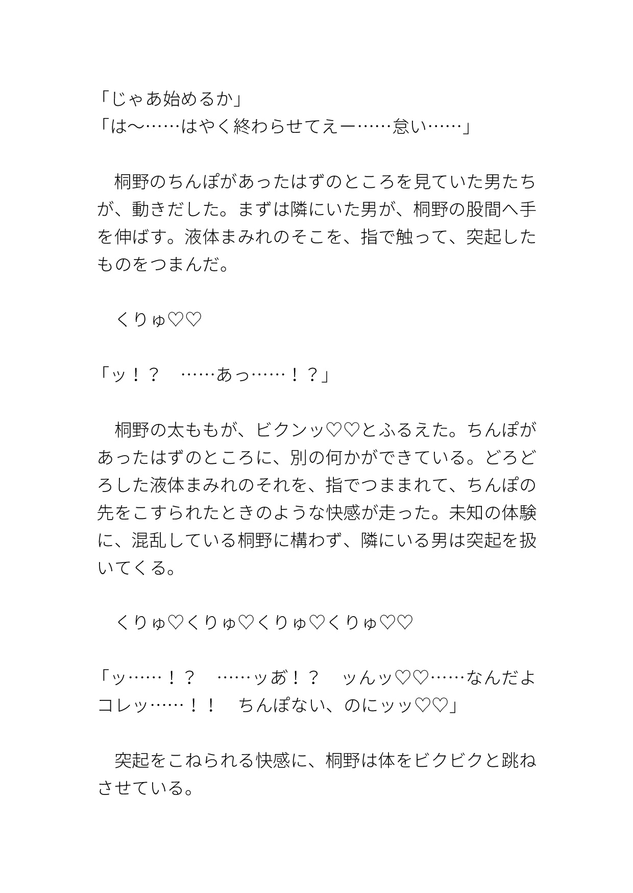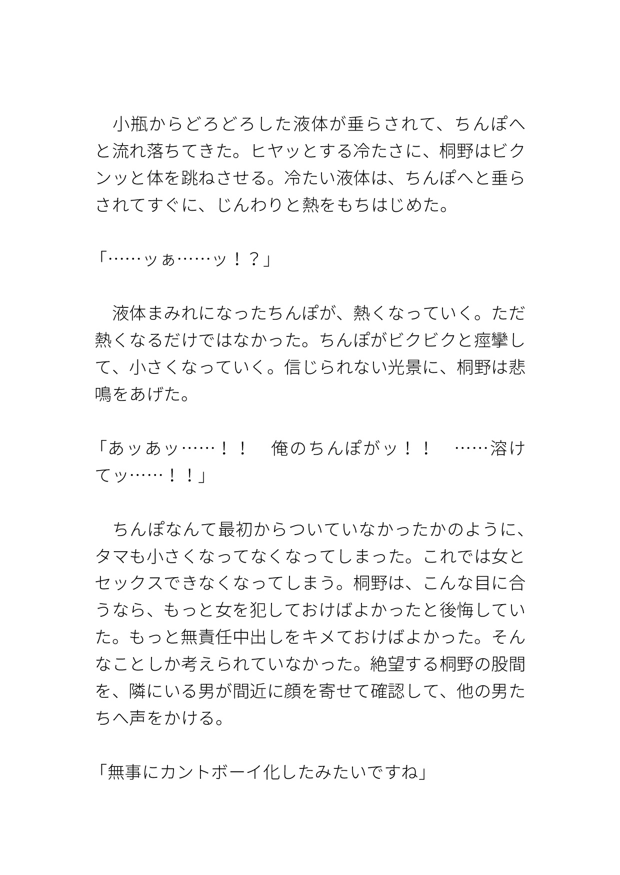 男とぶつかった後に気を失い、気がつくと車内にいた。そこで小瓶の液体をかけられ、カントボーイ化させられる。