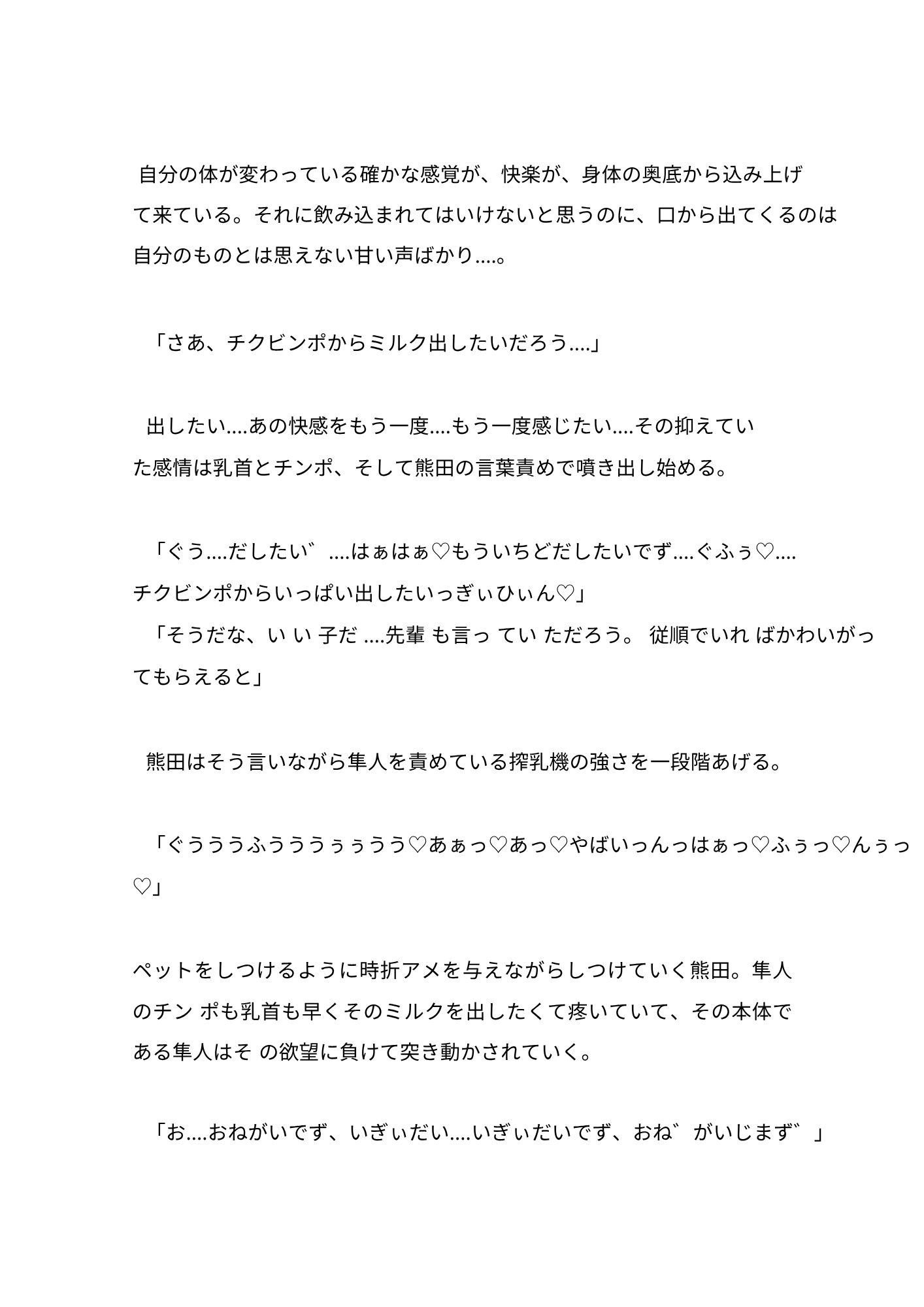 ・愛好家の間で男の精液と乳ミルクは高値で取引されていて、組織はその薬をつかい男の精液と乳ミルクを大量生産し利益を得ている。