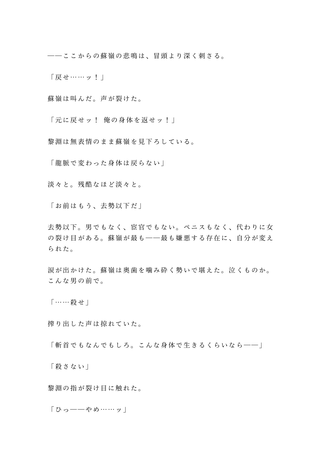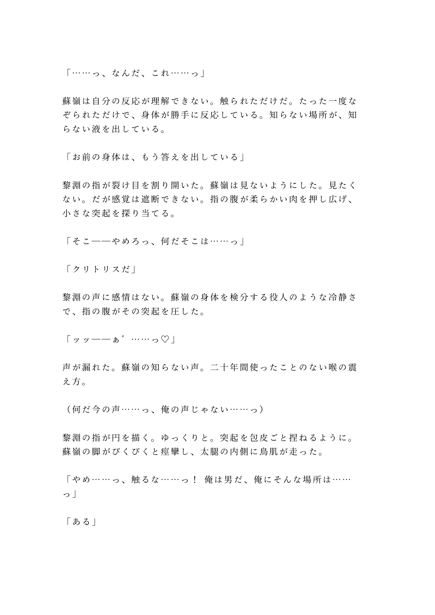 逃げ道を断たれた蘇嶺の身体に、龍脈の気が注ぎ込まれる。二十年かけて鍛え上げた男の身体が目の前で変わり、知らない感覚が全身を貫く。絶望と屈辱の中、黎淵の指は容赦なく蘇嶺の新しい身体を暴いていく。