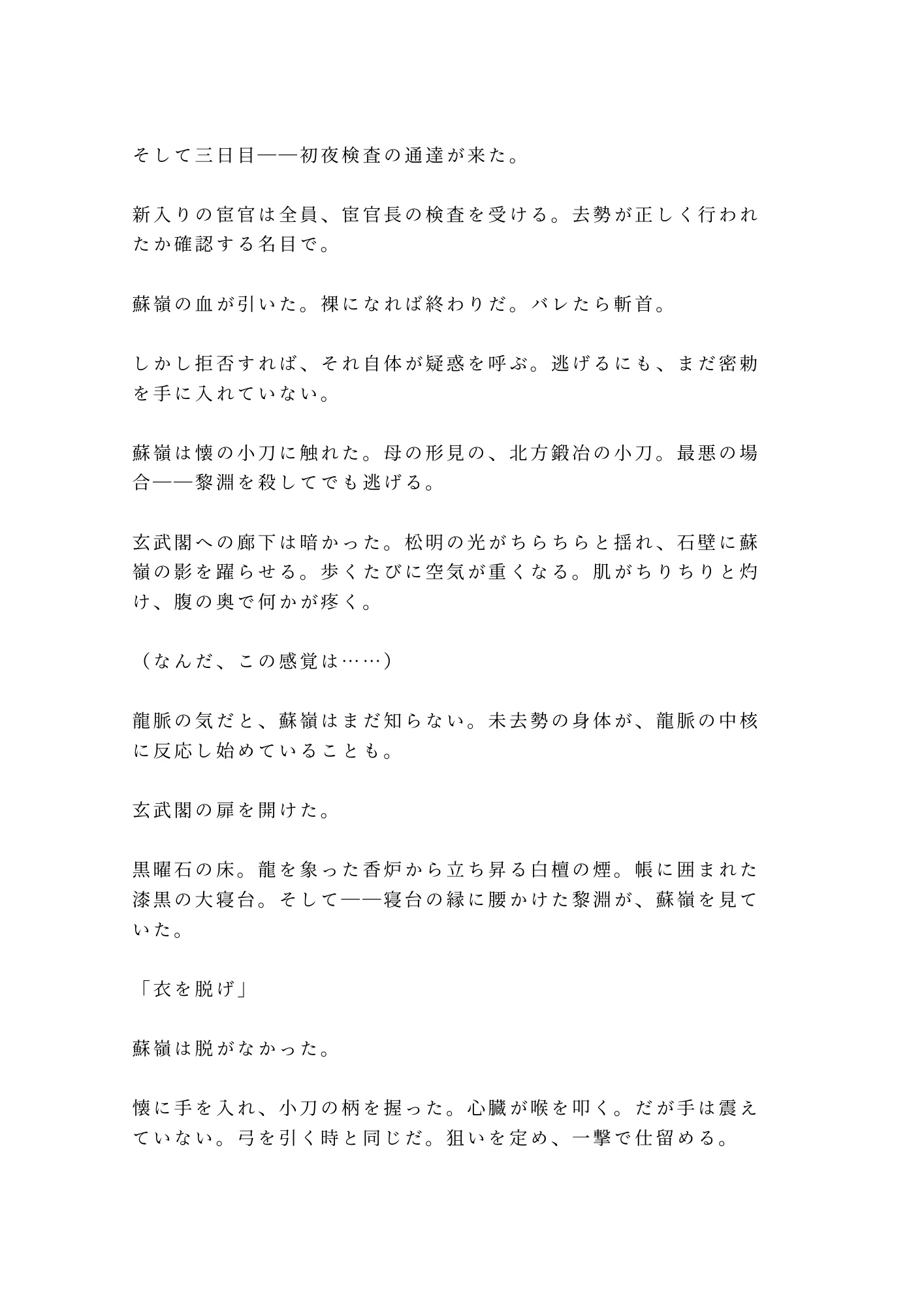 だが入宮三日目、初夜検査の名のもとに対峙したのは、皇帝直属の宦官長・黎淵。素手で刃を掴み、眉ひとつ動かさぬ武人。偽装はすでに見破られていた。