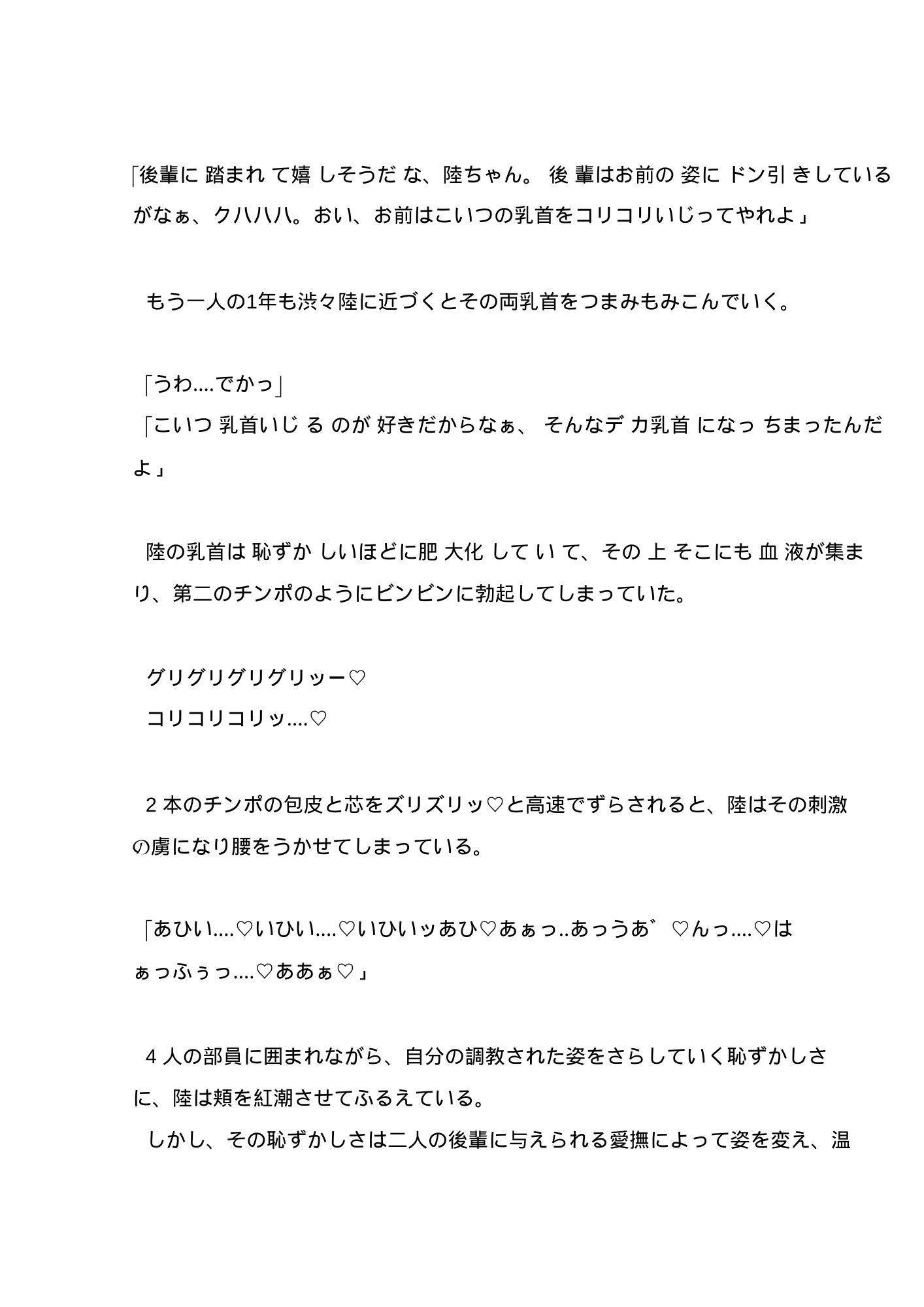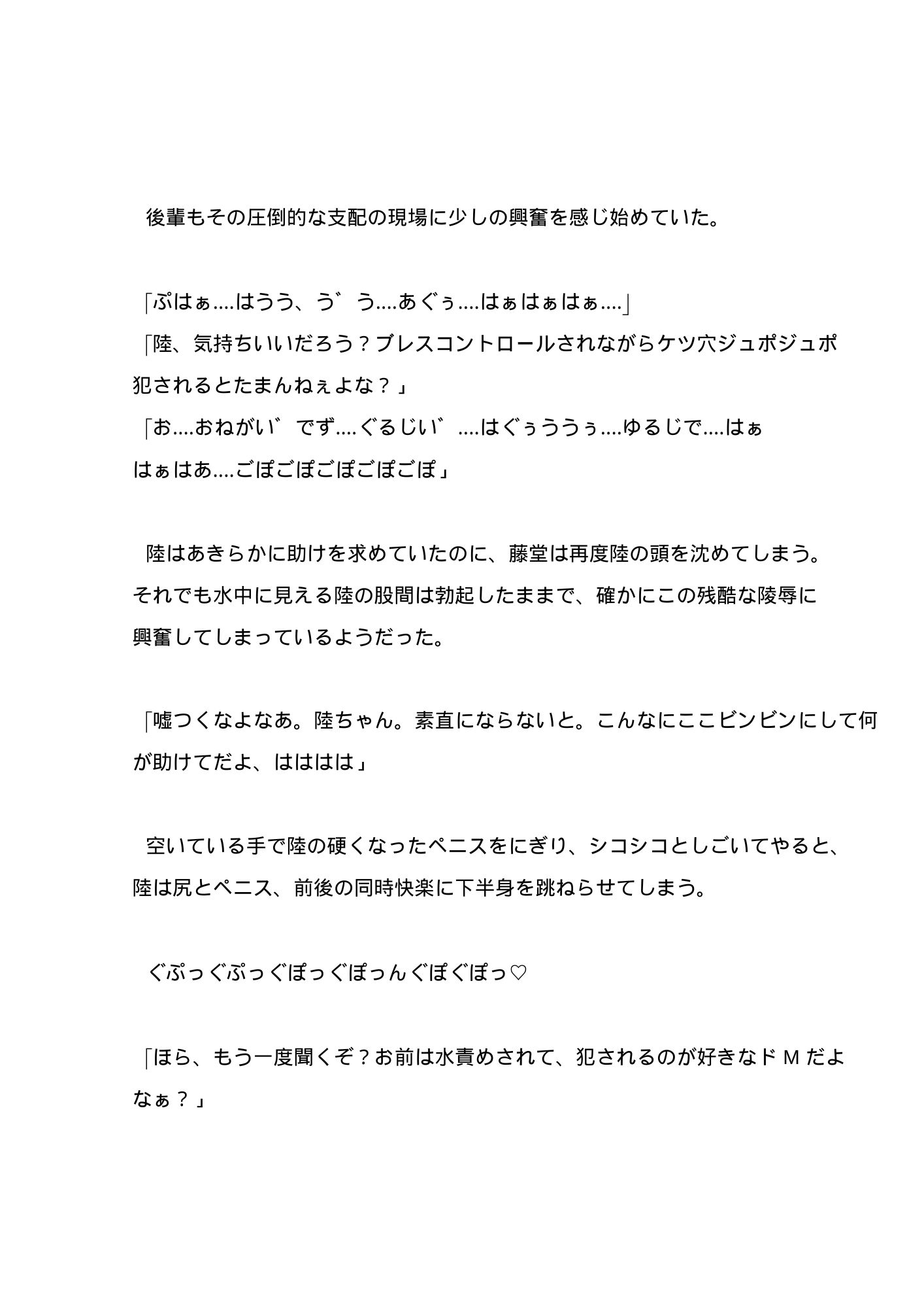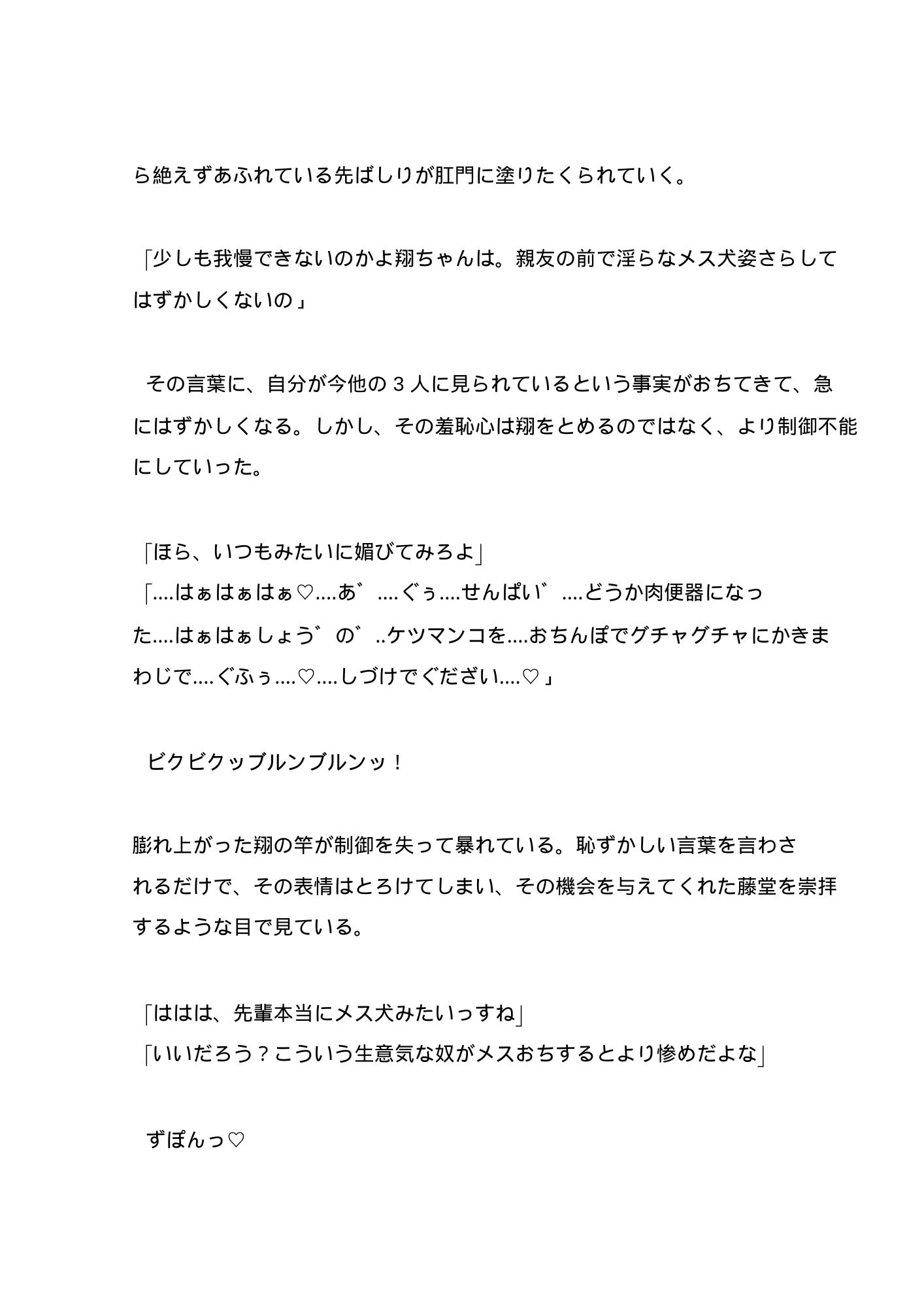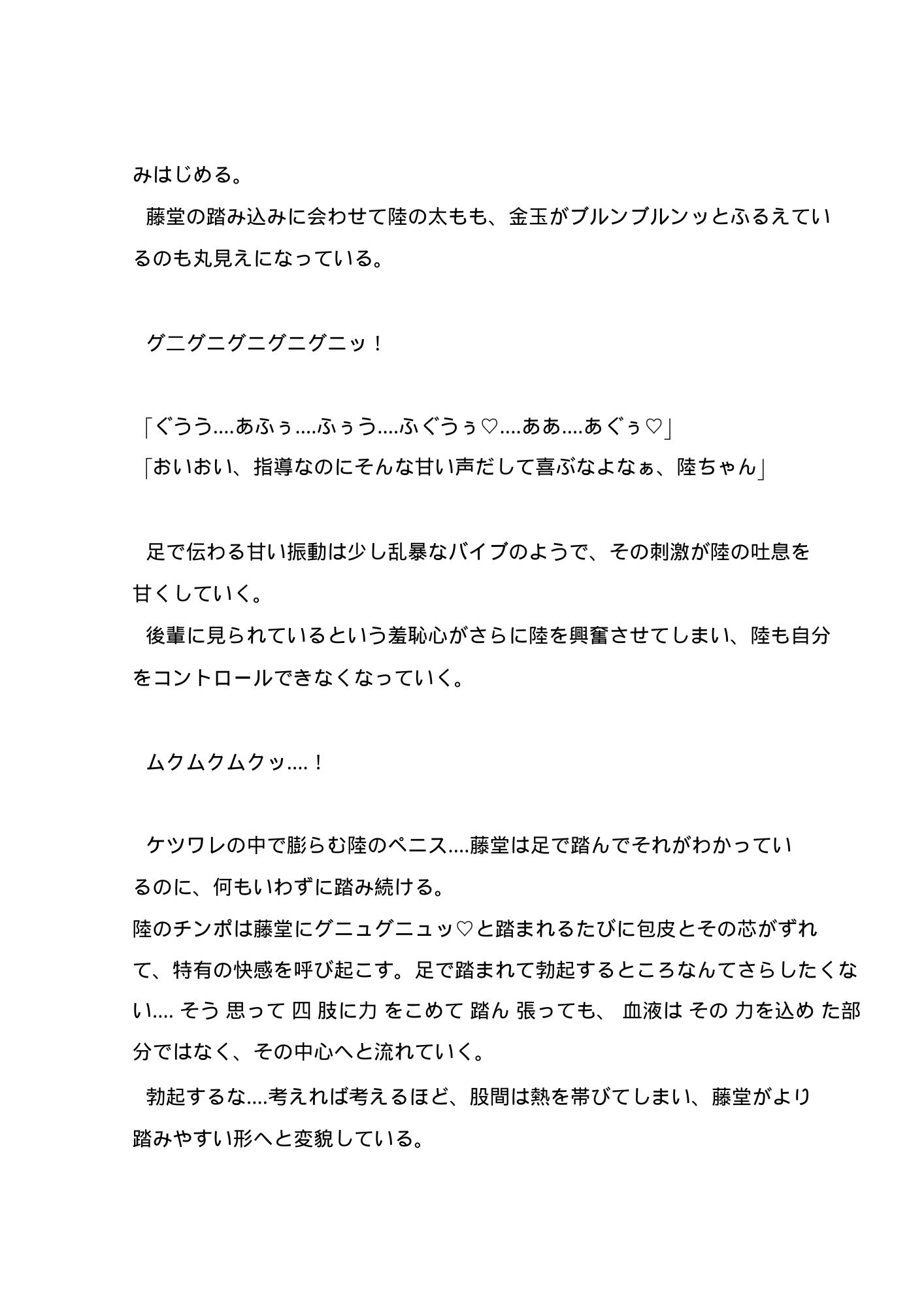 後輩の前での羞恥、電気あんま、羞恥、小便がけ、水責め、ベロチュウ、中出し、輪〇等