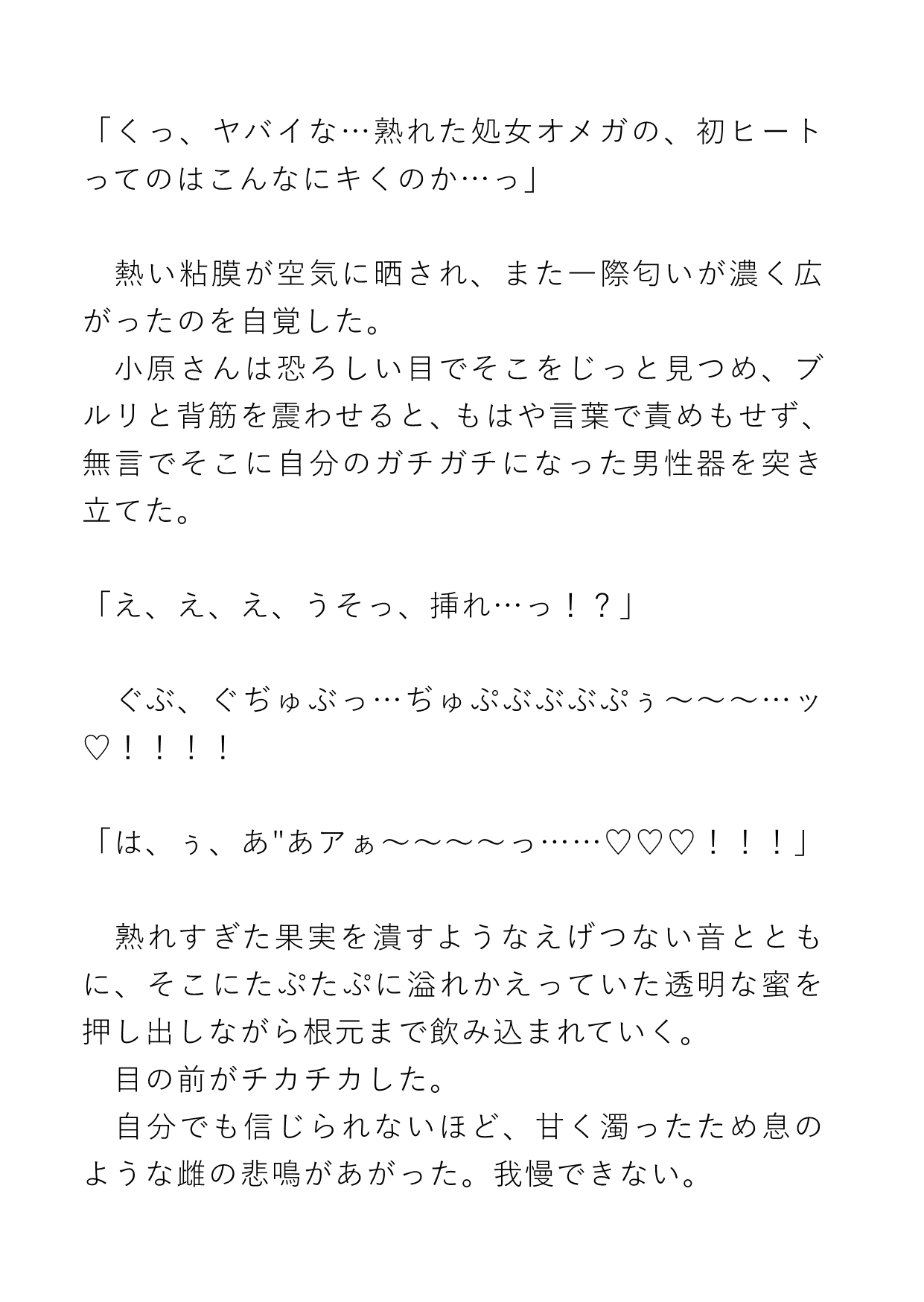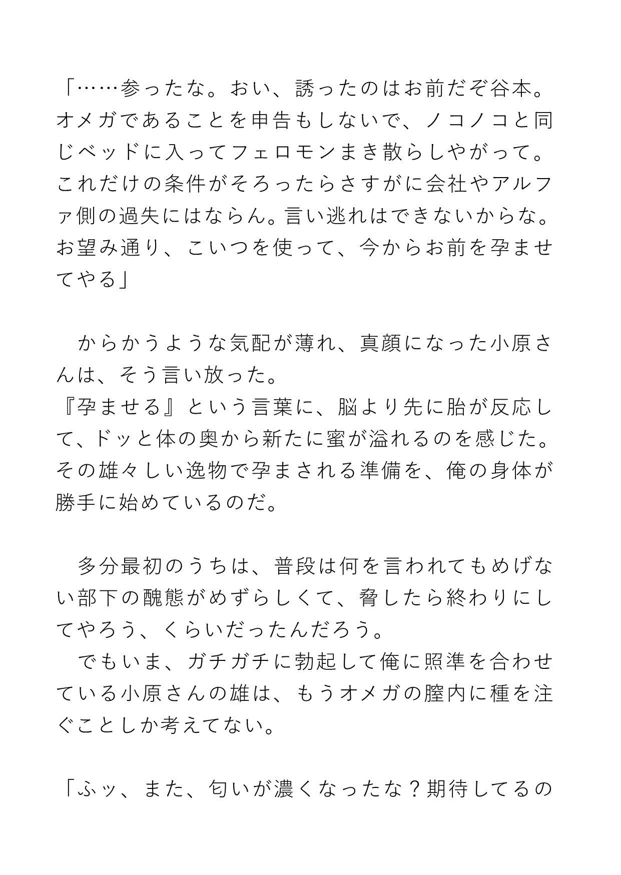 不仲な二人が出張先ホテルで同じ部屋になってしまい、そこで部下は生まれて初めてのヒートになってしまう。