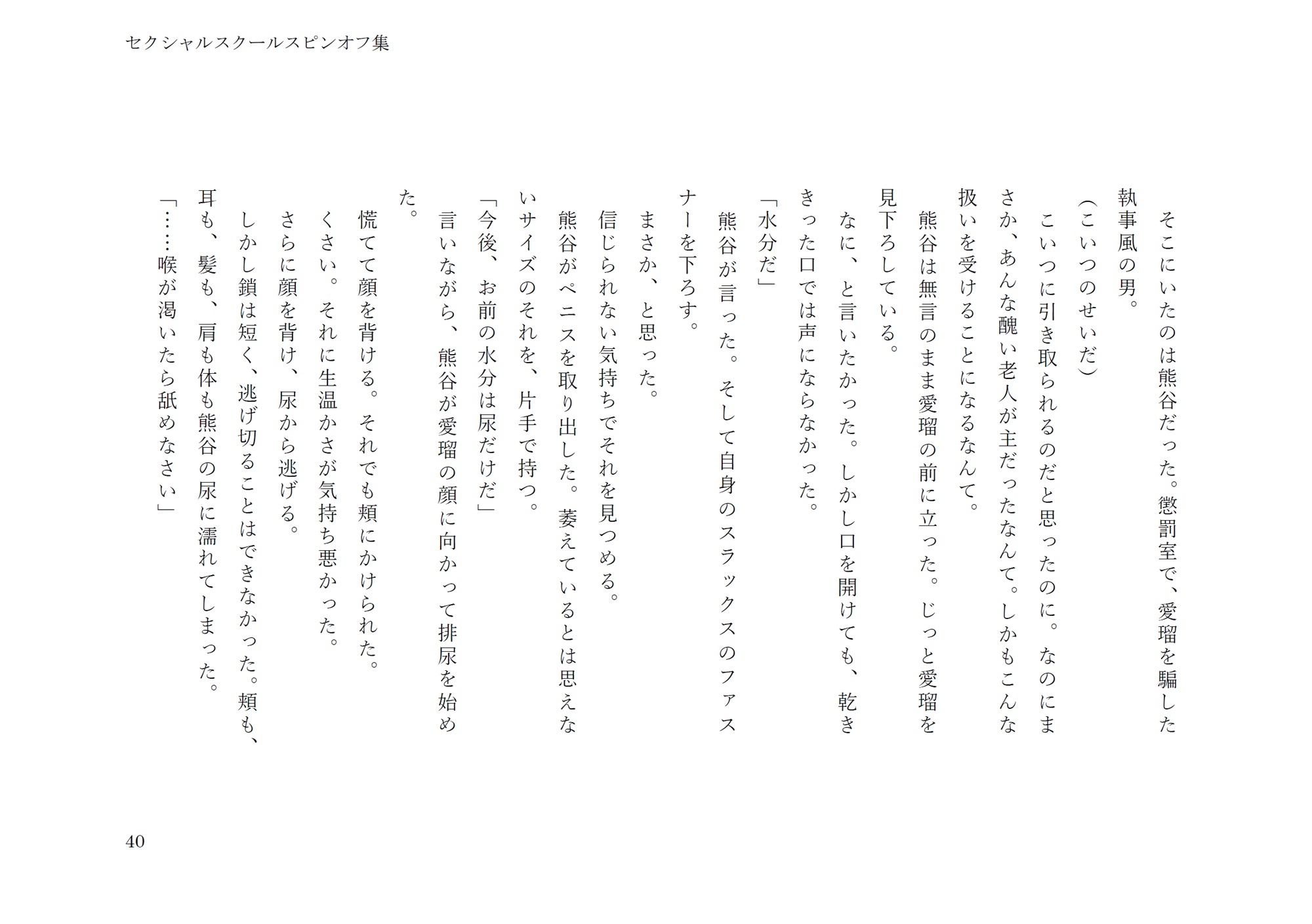 懲罰室・拘束・ディルド・結腸責め・かゆみ責め・竿玉スパンキング・目隠し・飲尿・放尿・●姦・フェラチオなど