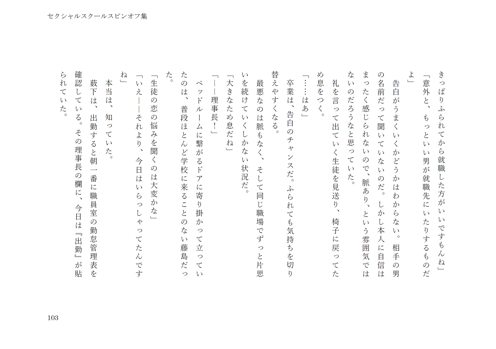 『臆病者の恋』……養護教諭、理事長、藤田の話。