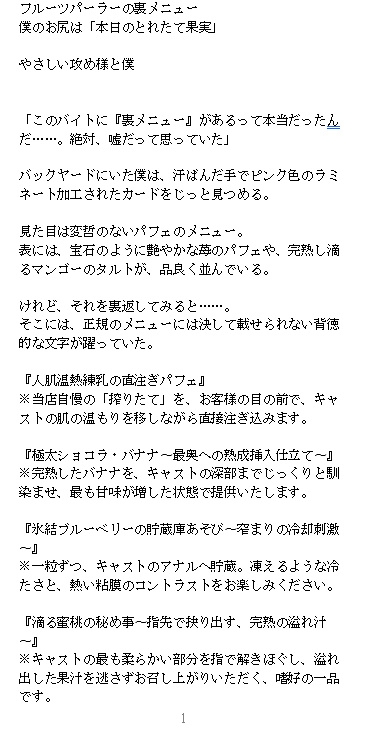 ![フルーツパーラーの裏メニュー 僕のお尻は「本日のとれたて果実」 [未挿入快感ルーム] フルーツパーラーの裏メニュー 僕のお尻は「本日のとれたて果実」 [未挿入快感ルーム]](http://img.dlsite.jp/modpub/images2/parts/RJ01598000/RJ01597801/4c5f65b2ac3a0c28afaa6ba444532e57.jpg)