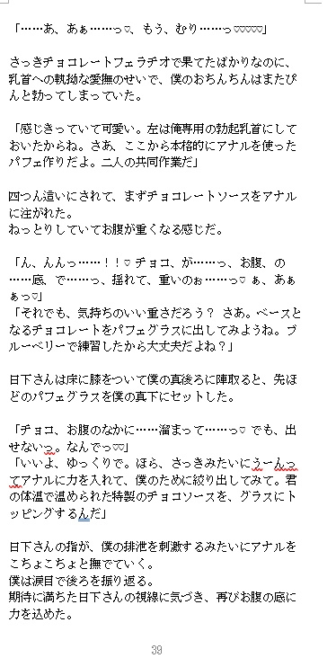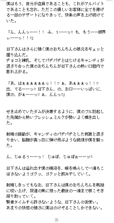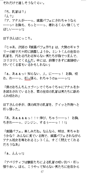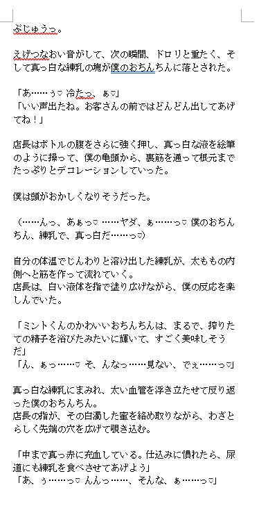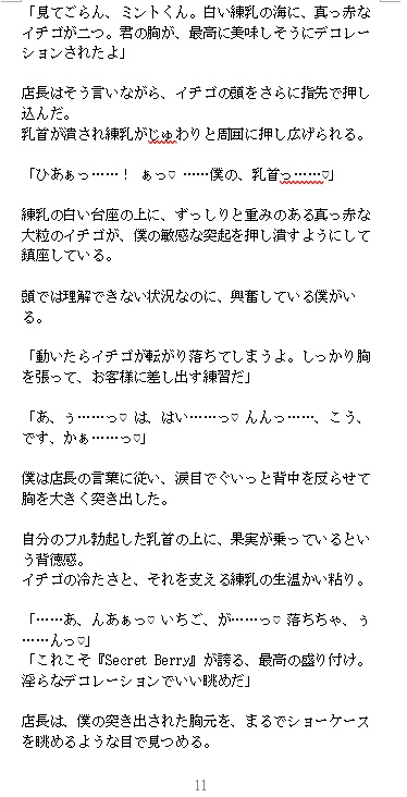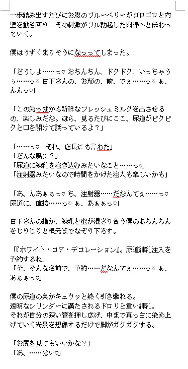 店長による過激な「仕込み研修」で、おちんちんを真っ白な練乳でデコレーションされ 、乳首をイチゴパフェの台座へと変えられ、さらに、ミントのアナルは氷結ブルーベリーを貯蔵する直腸貯蔵庫へと作り替えられてしまう 。