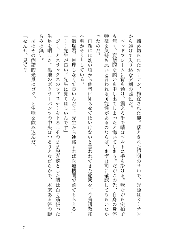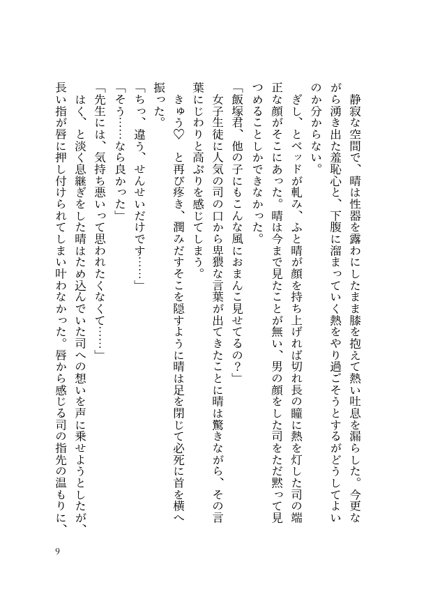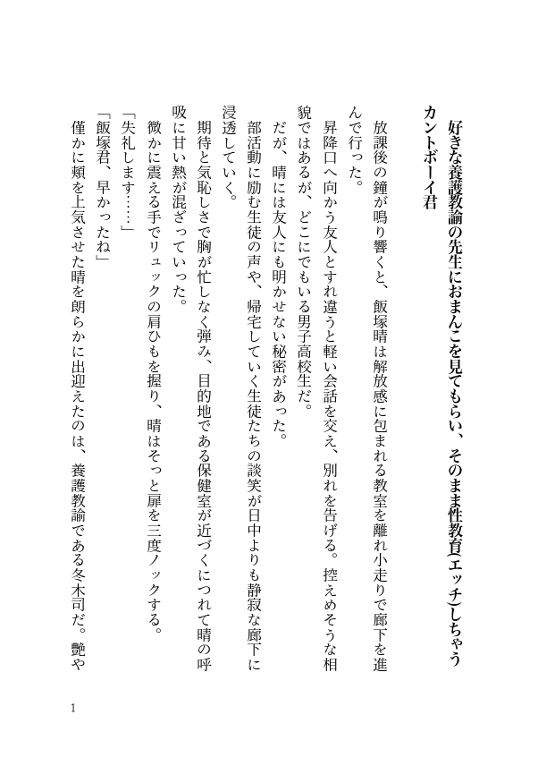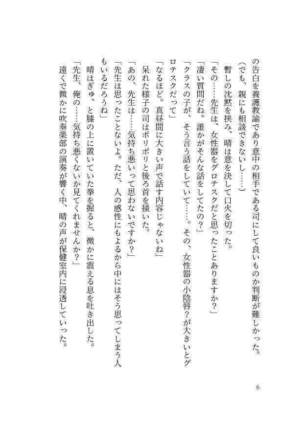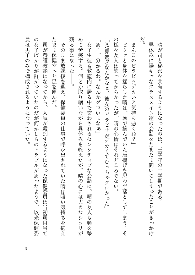 学校内で人気を集める美形養護教諭冬木司へ片思いをしていた保健委員でありカントボーイでもある飯塚晴がクラスメイトの「まんこのビラビラがでかいとグロイ」と言う会話を聞き、それならば好きな相手にまんこが変じゃないか見てもらおうと思い切って見てもらうことに。