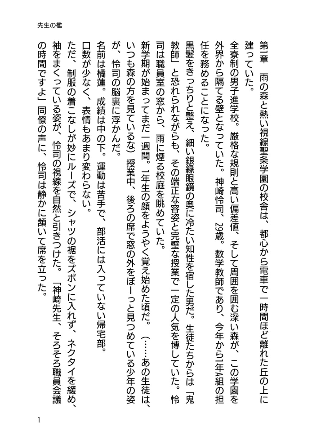 そこで数学教師を務める神崎怜司(29)は、冷徹で完璧主義の「鬼教師」と恐れられる男だった。ある雨の夜、校舎裏の森で門限を破っていた1年生の橘蓮と出会う。